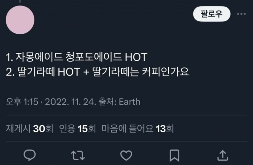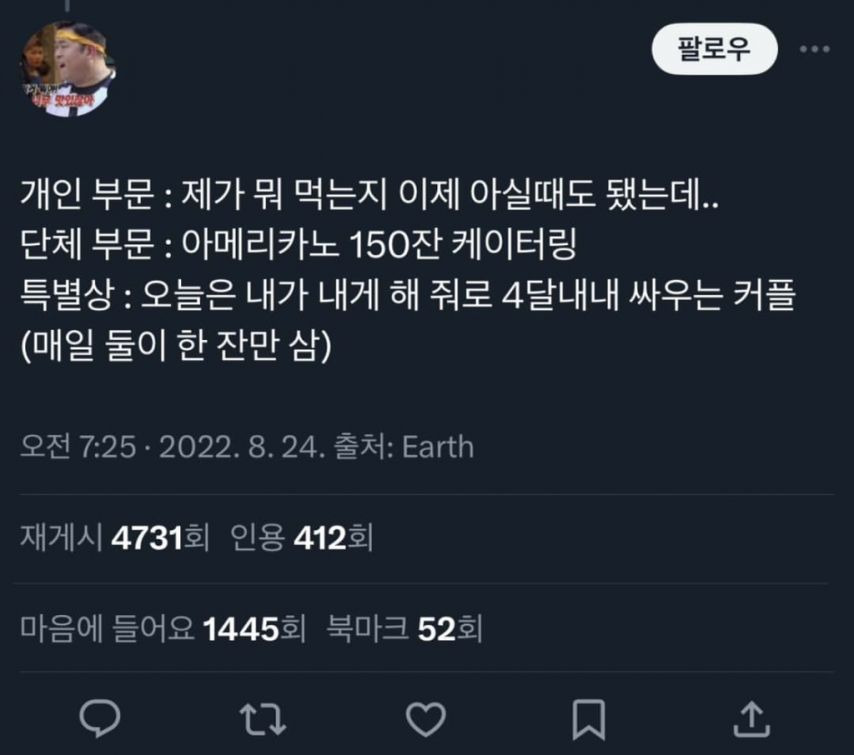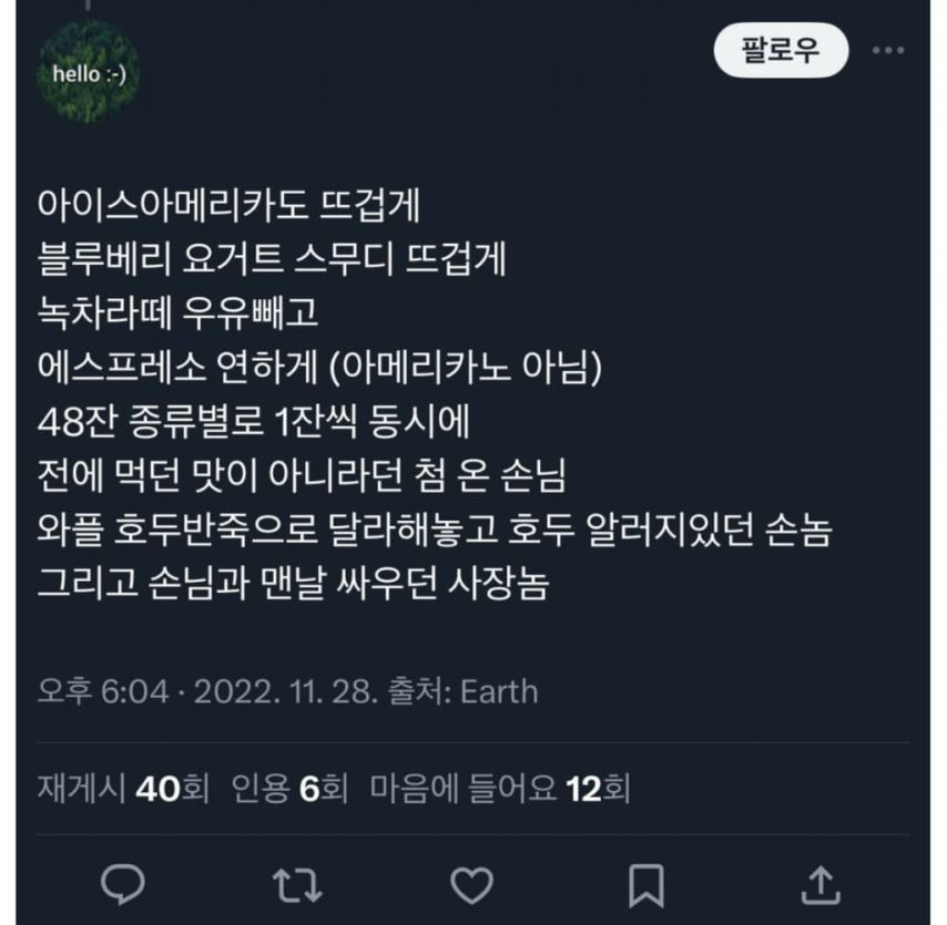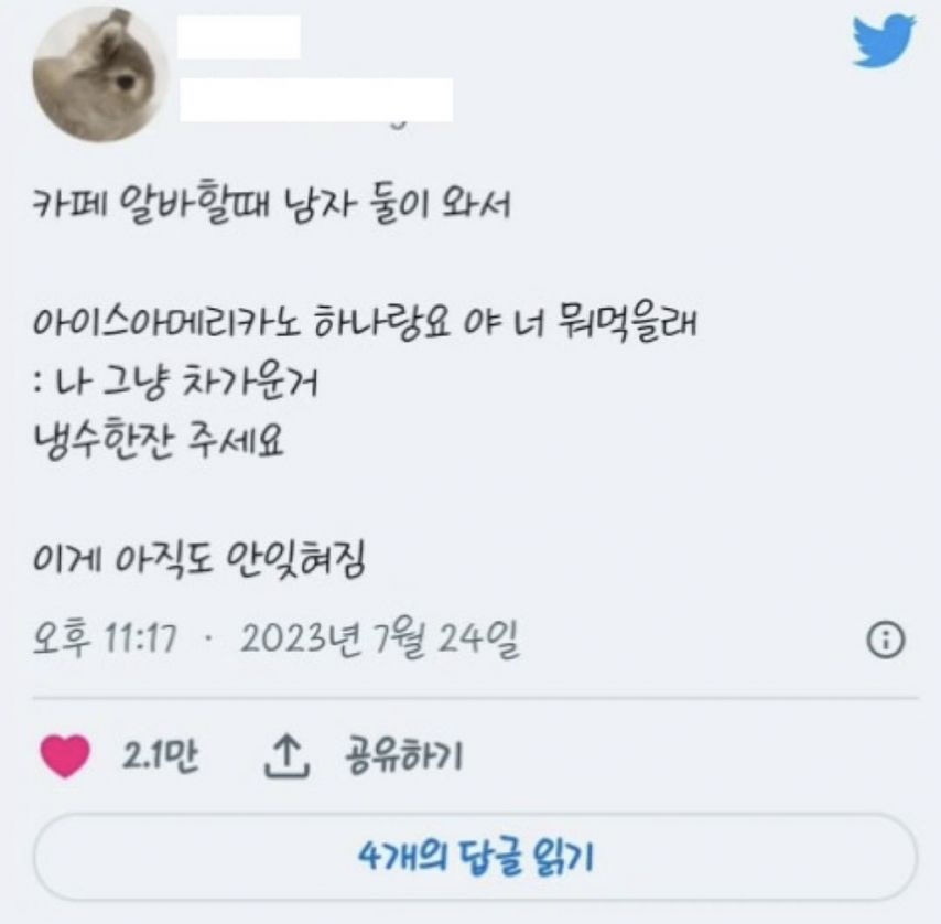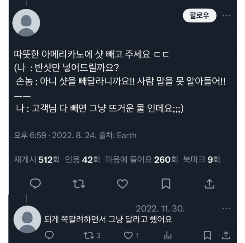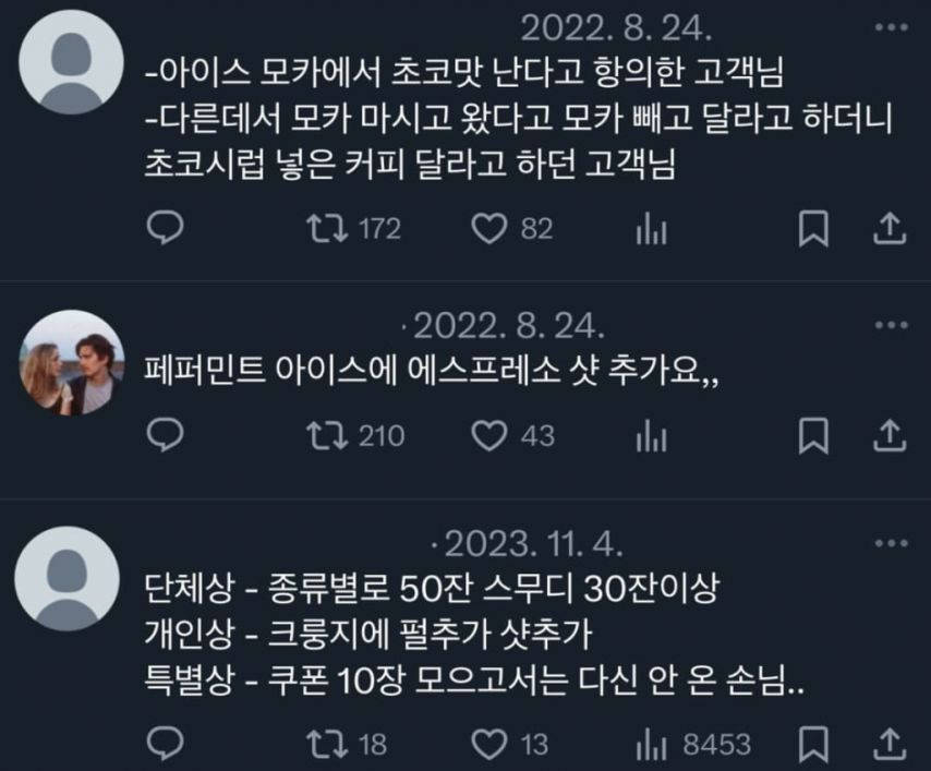 카페 알바생들이 받은 황당한 주문 작성자인조인간 17호|작성시간25.11.01|조회수10,435 목록 댓글 1 글자크기 작게가 글자크기 크게가 다음검색 현재 게시글 추가 기능 열기 북마크 공유하기 신고 센터로 신고 댓글 댓글 1 댓글쓰기 답글쓰기 댓글 리스트 작성자버츠비 | 작성시간 25.11.01 아메리카노 150잔 케이터링은 왜 그런걸까150잔은 너무적나 모르겠네ㄷㄷ쿠키1개는 사가는사람이 먹으려고 그런가봄ㅎㅎ 댓글 전체보기