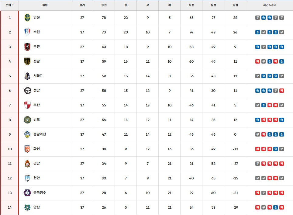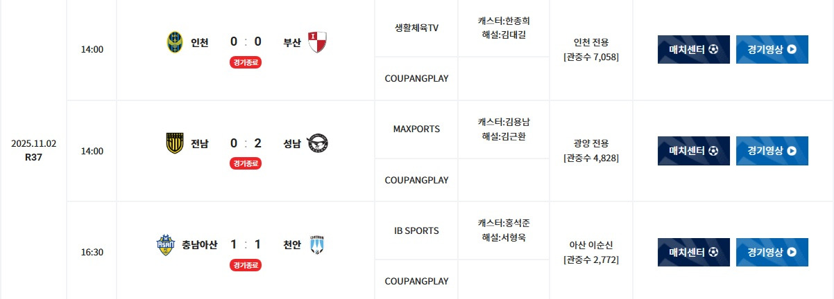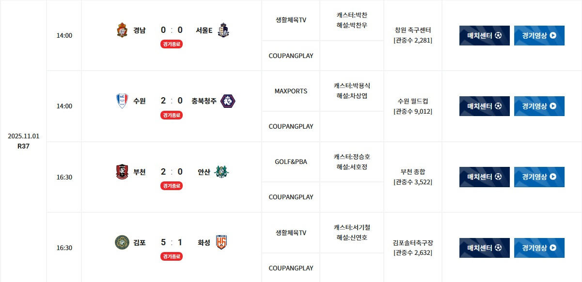 [스포츠]2025 하나은행 K리그2 37R 순위 및 결과 작성자음교수2|작성시간25.11.02|조회수1,660 목록 댓글 4 글자크기 작게가 글자크기 크게가 다음검색 현재 게시글 추가 기능 열기 북마크 공유하기 신고 센터로 신고 댓글 댓글 4 댓글쓰기 답글쓰기 댓글 리스트 작성자버츠비 | 작성시간 25.11.02 전남은 성남한테 잡혀서 플옵이 애매해졌네\남은 경기도 쉽지 않은데 ㄷㄷ 작성자뱅콩 | 작성시간 25.11.02 부천 3위확정! 답댓글 작성자알레부천 | 작성시간 25.11.02 아직입니다. 2경기 남았어요. 답댓글 작성자뱅콩 | 작성시간 25.11.03 알레부천 헉 1경기 남은줄 알았어요ㅜㅜ 정보 감사합니다! 댓글 전체보기