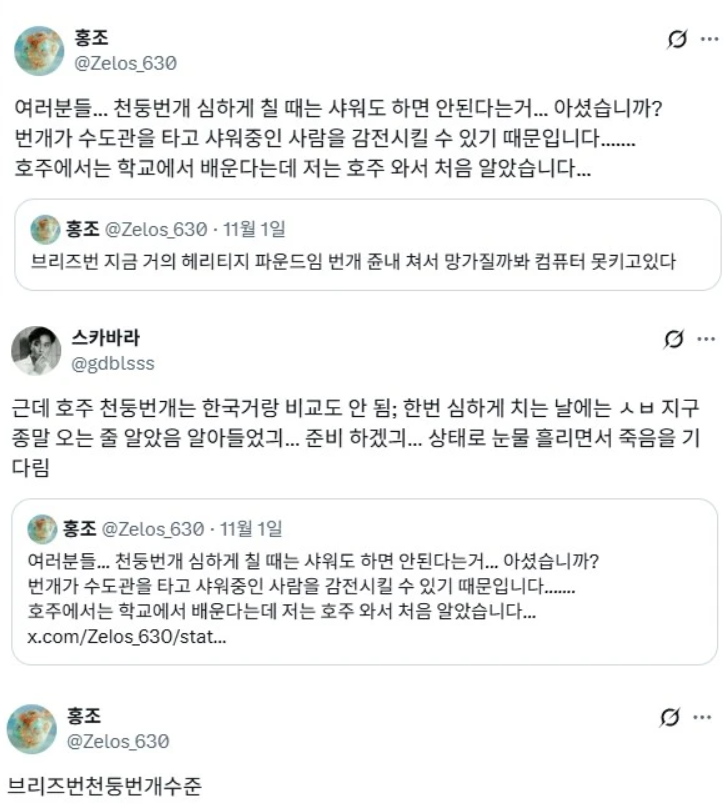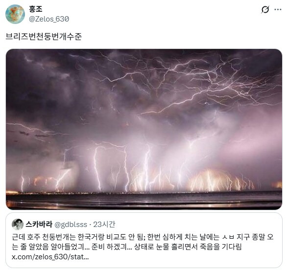 천둥번개 칠때 샤워도 하면 안된다는 호주 작성자인조인간 17호|작성시간25.11.03|조회수35,799 목록 댓글 9 글자크기 작게가 글자크기 크게가 다음검색 현재 게시글 추가 기능 열기 북마크 공유하기 신고 센터로 신고 댓글 댓글 9 댓글쓰기 답글쓰기 댓글 리스트 작성자에라스네츠 | 작성시간 25.11.03 외국은 도대체 어떤 곳이길래 다 크네 진짜 작성자송가인 | 작성시간 25.11.03 무슨 cg인줄 작성자칸수 | 작성시간 25.11.03 뇌우ㄷㄷ 작성자인조인간 17호 작성자 본인 여부 작성자 | 작성시간 25.11.03 호주는 뭐든 다 크네 작성자Worldcup | 작성시간 25.11.03 사이오닉 스톰 댓글 전체보기