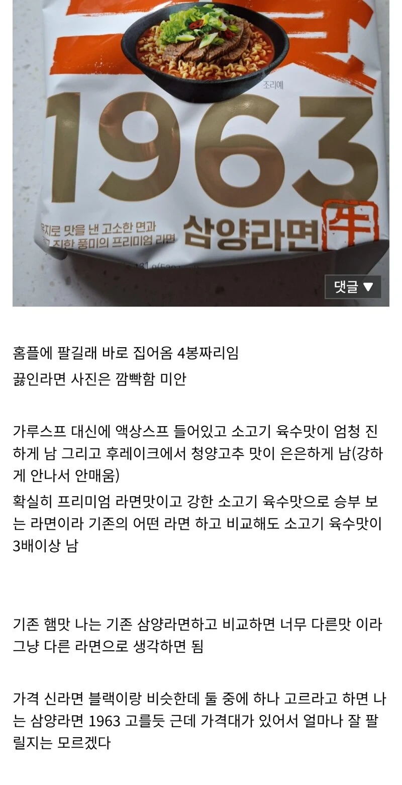 커뮤에 올라온 삼양 1963 라면 후기 작성자인조인간 17호|작성시간25.11.03|조회수35,858 목록 댓글 11 글자크기 작게가 글자크기 크게가 다음검색 현재 게시글 추가 기능 열기 북마크 공유하기 신고 센터로 신고 댓글 댓글 11 댓글쓰기 답글쓰기 댓글 리스트 작성자제갈량 공명 | 작성시간 25.11.03 한번은 먹어봐야겠네요 ㅋㅋ 작성자골반의 지배자 기성용 | 작성시간 25.11.03 와우 답댓글 작성자골반의 지배자 기성용 | 작성시간 25.11.03 네이버에 파네요ㅋㅋ 바로 주문 갈김 작성자여름이 | 작성시간 25.11.03 전 삼양라면 햄맛때문에 제스탈이 아니던데 요건 다르려나 작성자CH츄UU | 작성시간 25.11.03 언제부터인가 가격 올리면서 죄다 1묶음 5개짜리 다 4개로 바꾸네 댓글 전체보기