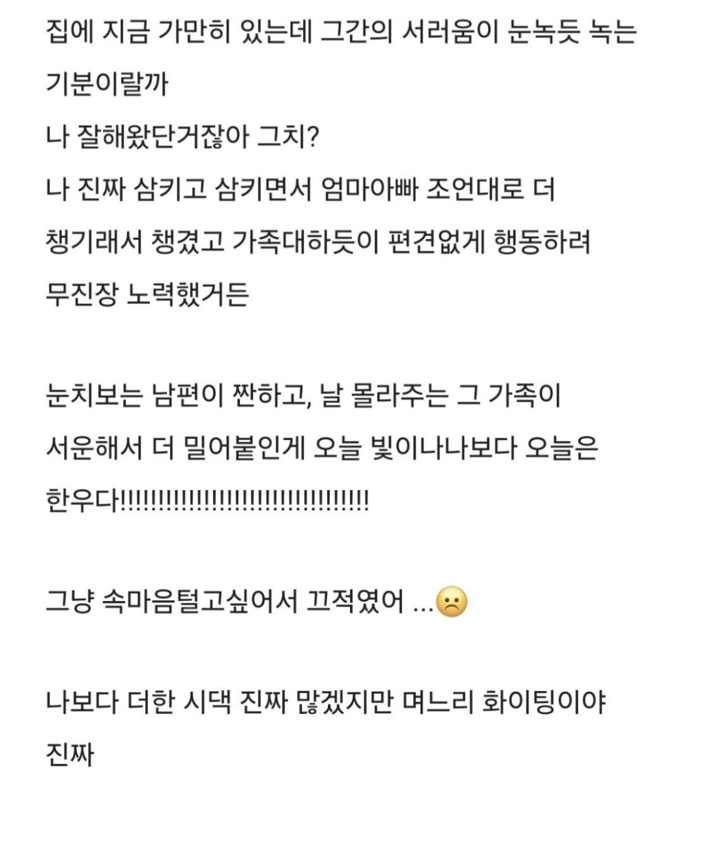 5년만에 받는 시어머니 사과에 마음이 녹아.blind 작성자우정잉5|작성시간25.11.03|조회수13,505 목록 댓글 16 글자크기 작게가 글자크기 크게가 ㅠㅠ 다음검색 현재 게시글 추가 기능 열기 북마크 공유하기 신고 센터로 신고 댓글 댓글 16 댓글쓰기 답글쓰기 댓글 리스트 작성자LIVERPOOL FC | 작성시간 25.11.03 화이팅. 그시어머니에그며느리 작성자공격 축구 | 작성시간 25.11.03 진짜 멋지십니다제가 여자였어도 못했을듯 작성자치타 | 작성시간 25.11.03 너무 따뜻ㅠㅠ 작성자께께오톡 | 작성시간 25.11.03 마음고생 심하셨겠다 작성자피버노바 | 작성시간 25.11.03 드센게 아니라 원래부터 좋은 사람인 거 댓글 전체보기