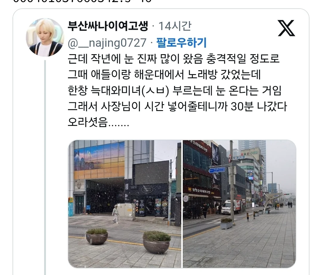 [SNS]작년 부산 폭설 온 날 작성자맨소래담|작성시간25.11.03|조회수4,091 목록 댓글 3 글자크기 작게가 글자크기 크게가 다음검색 현재 게시글 추가 기능 열기 북마크 공유하기 신고 센터로 신고 댓글 댓글 3 댓글쓰기 답글쓰기 댓글 리스트 작성자밀키스 | 작성시간 25.11.03 폭설 ㄷㄷ 작성자뽀무빵삑 | 작성시간 25.11.03 도시 마비됐겠는데 작성자H_Crespo | 작성시간 25.11.03 폭설 ㄷㄷㄷ 댓글 전체보기