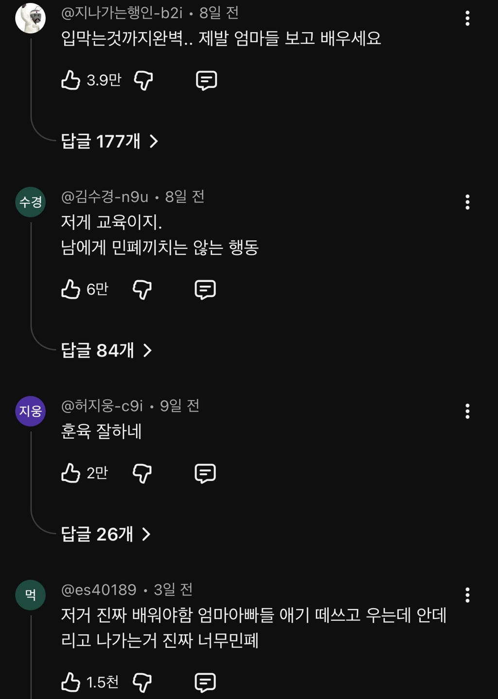 작성자마린팩 작성시간 25.11.03 딱 적당한거 같네요 훈육도 데리고 나가서 해야지 그 자리에서 애 쥐잡듯이 잡는거 보니까 그거도 진짜 별로더라구요..