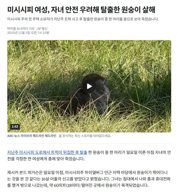 근처에 살던 5남매의 엄마가 원숭이를 발견,
