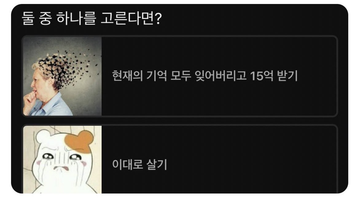 [VS]현재의 기억 대신 15억 VS 그냥 이대로살기.jpg 작성자Real Reds|작성시간25.11.04|조회수3,230 목록 댓글 4 글자크기 작게가 글자크기 크게가 다음검색 현재 게시글 추가 기능 열기 북마크 공유하기 신고 센터로 신고 댓글 댓글 4 댓글쓰기 답글쓰기 댓글 리스트 작성자인유특전대 | 작성시간 25.11.04 치매 걸리고 15억 받으면 그게 무슨 소용인가.. 작성자유빈 | 작성시간 25.11.04 그냥 살겠음 작성자박상미 | 작성시간 25.11.04 그냥 살아야지 작성자인천갈매기 | 작성시간 25.11.04 걸음마 부터 다시 배워야 한다고? 댓글 전체보기