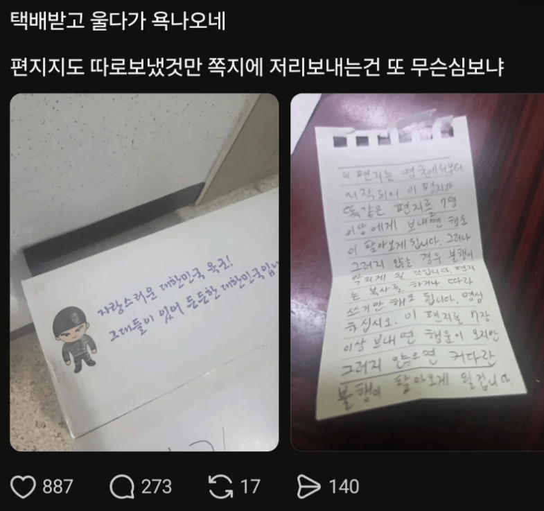 훈련소에서 온 아들 편지받고 빡친 엄마 작성자러바오|작성시간25.11.05|조회수37,718 목록 댓글 3 글자크기 작게가 글자크기 크게가 다음검색 현재 게시글 추가 기능 열기 북마크 공유하기 신고 센터로 신고 댓글 댓글 3 댓글쓰기 답글쓰기 댓글 리스트 작성자GFYS | 작성시간 25.11.05 행운의편지…ㅋㅋㅋㅋ 작성자별이삼샵 | 작성시간 25.11.05 엄마 걱정할까봐 저렇게 보냈나?ㅋㅋㅋ 작성자pyspsy | 작성시간 25.11.05 ㅋㅋㅋㅋㅋㅋㅋㅋ감정표현이 서툴러서 그런듯 댓글 전체보기