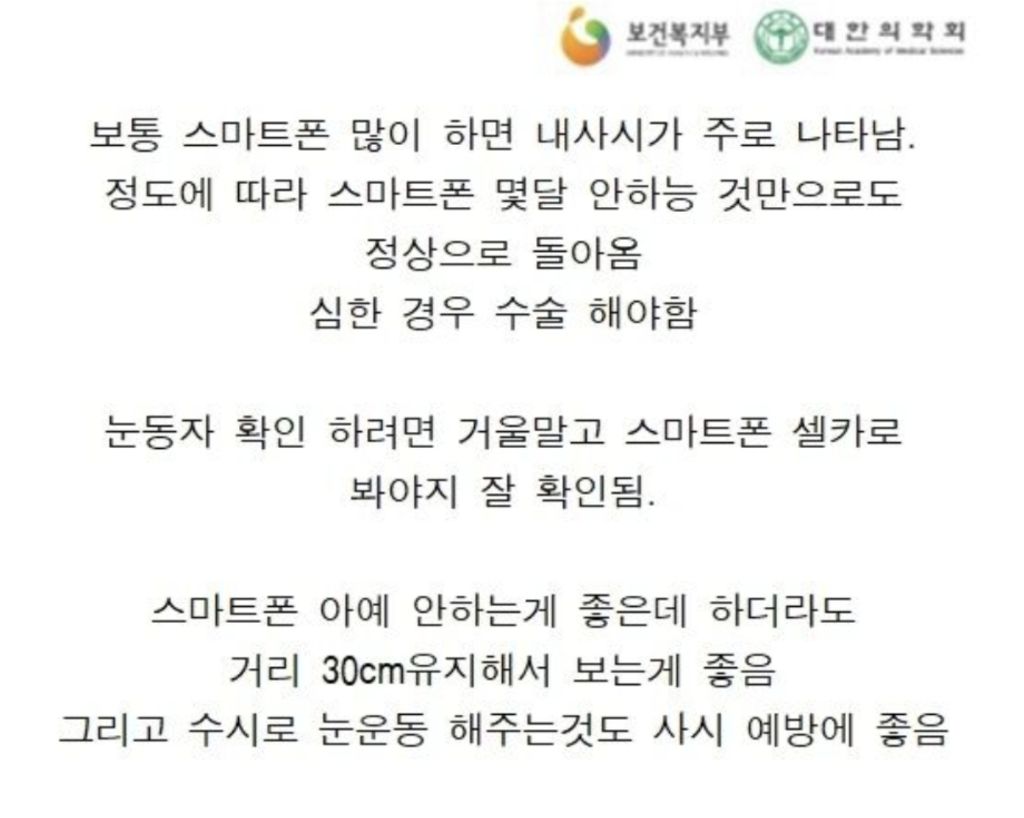 [기타]스마트폰 많이 하면 나타나는 후천성 사시.jpg 작성자강동구주민 3|작성시간25.11.05|조회수5,212 목록 댓글 1 글자크기 작게가 글자크기 크게가 다음검색 현재 게시글 추가 기능 열기 북마크 공유하기 신고 센터로 신고 댓글 댓글 1 댓글쓰기 답글쓰기 댓글 리스트 작성자토로로쀼뀨 | 작성시간 25.11.05 요즘 벌써 노안온거처럼 눈아픈데 슬프다 댓글 전체보기
