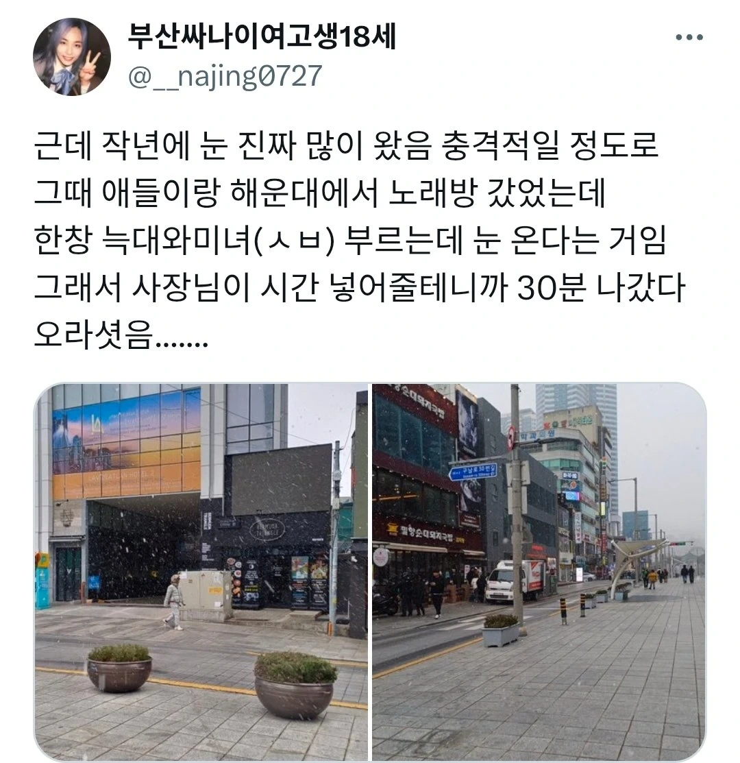 노래방 사장님이 서비스를 준 이유 작성자인조인간 17호|작성시간25.11.06|조회수7,069 목록 댓글 5 글자크기 작게가 글자크기 크게가 다음검색 현재 게시글 추가 기능 열기 북마크 공유하기 신고 센터로 신고 댓글 댓글 5 댓글쓰기 답글쓰기 댓글 리스트 작성자Moonrise💙 | 작성시간 25.11.06 ㅋㅋㄱㅋㅋ 낭만 작성자H_Crespo | 작성시간 25.11.06 ㅋㅋㅋㅋㅋ 작성자당근마켓 | 작성시간 25.11.06 와 작성자첫댓글 | 작성시간 25.11.06 저만큼온게 충격적으로 많이온거군 작성자로봇왕위잉치킹 | 작성시간 25.11.06 부산에서 눈은 귀하지 댓글 전체보기