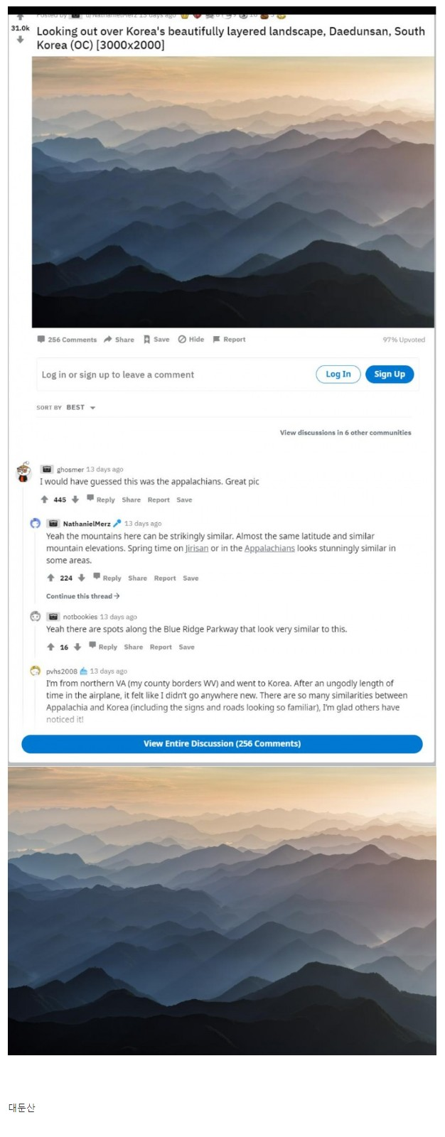 레딧에서 화제가 된 한국의 산맥 작성자ChatGPT|작성시간25.11.06|조회수38,109 목록 댓글 15 글자크기 작게가 글자크기 크게가 푸른색부터 붉은색감까지 그라데이션이 예술임 다음검색 현재 게시글 추가 기능 열기 북마크 공유하기 신고 센터로 신고 댓글 댓글 15 댓글쓰기 답글쓰기 댓글 리스트 작성자분노의바르셔 | 작성시간 25.11.06 어디 대둔산이래요 작성자독거노인 | 작성시간 25.11.06 와 진짜 멋잇ㄷㅏㅠㅠㅠ 작성자깐징 | 작성시간 25.11.06 흐음.. 작성자Inter | 작성시간 25.11.06 오 작성자맨밥 | 작성시간 25.11.07 우리나라 산은 뾰족 솟은 맛이 없지만 구릉성 산지로 기복이 적어 산그리메가 멋짐. 댓글 전체보기