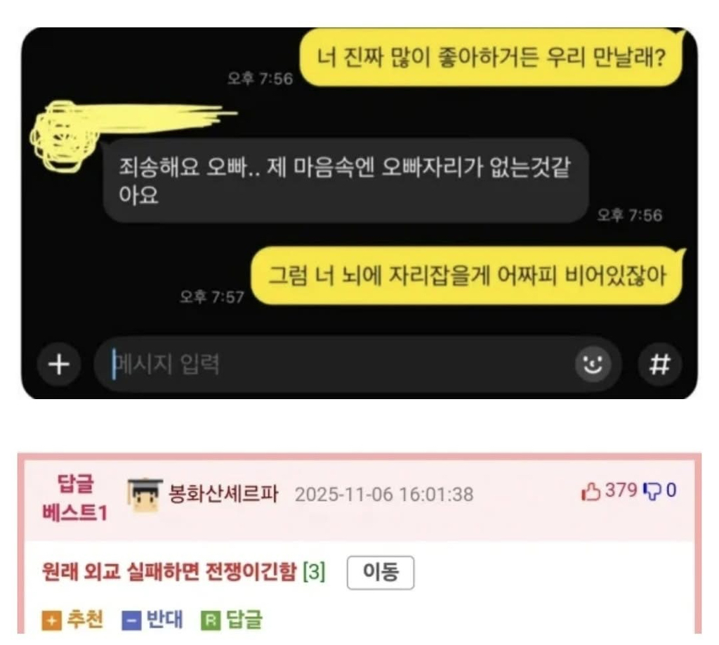 고백 공격 - 방어 - 카운터 작성자가을날3|작성시간25.11.08|조회수10,971 목록 댓글 3 글자크기 작게가 글자크기 크게가 다음검색 현재 게시글 추가 기능 열기 북마크 공유하기 신고 센터로 신고 댓글 댓글 3 댓글쓰기 답글쓰기 댓글 리스트 작성자도그허니잼 | 작성시간 25.11.08 고백..맞지....? 작성자이나경 | 작성시간 25.11.08 ㅋㅋㅋㅋㅋㅋ 작성자움프 | 작성시간 25.11.08 ㅋㅋㅋㅋㅋㅋㅋ 바로 가드올리네 댓글 전체보기