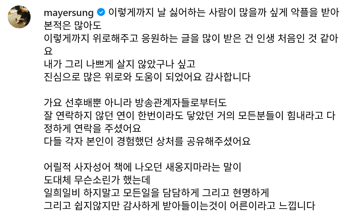 [SNS]성시경 인스타 작성자서울스날|작성시간25.11.09|조회수6,623 목록 댓글 9 글자크기 작게가 글자크기 크게가 https://www.instagram.com/p/DQ1o4dOAQIX/?utm_source=ig_web_copy_link&igsh=MzRlODBiNWFlZA== 다음검색 현재 게시글 추가 기능 열기 북마크 공유하기 신고 센터로 신고 댓글 댓글 9 댓글쓰기 답글쓰기 댓글 리스트 작성자Alessandro Nesta | 작성시간 25.11.09 힘내십시요 작성자1973_FCPS | 작성시간 25.11.09 쉽지않은 결정일텐데.. ㅜㅜ 화이팅입니다 형님 작성자완료다 | 작성시간 25.11.09 바쁜게 차라리 덜 고통스러울수도.. 작성자이나경 | 작성시간 25.11.10 ㅠㅠ 작성자Tensegrity Universe and Philosophy | 작성시간 25.11.10 충격이 컷을 것 같은데 잘 추스리시길.. 댓글 전체보기