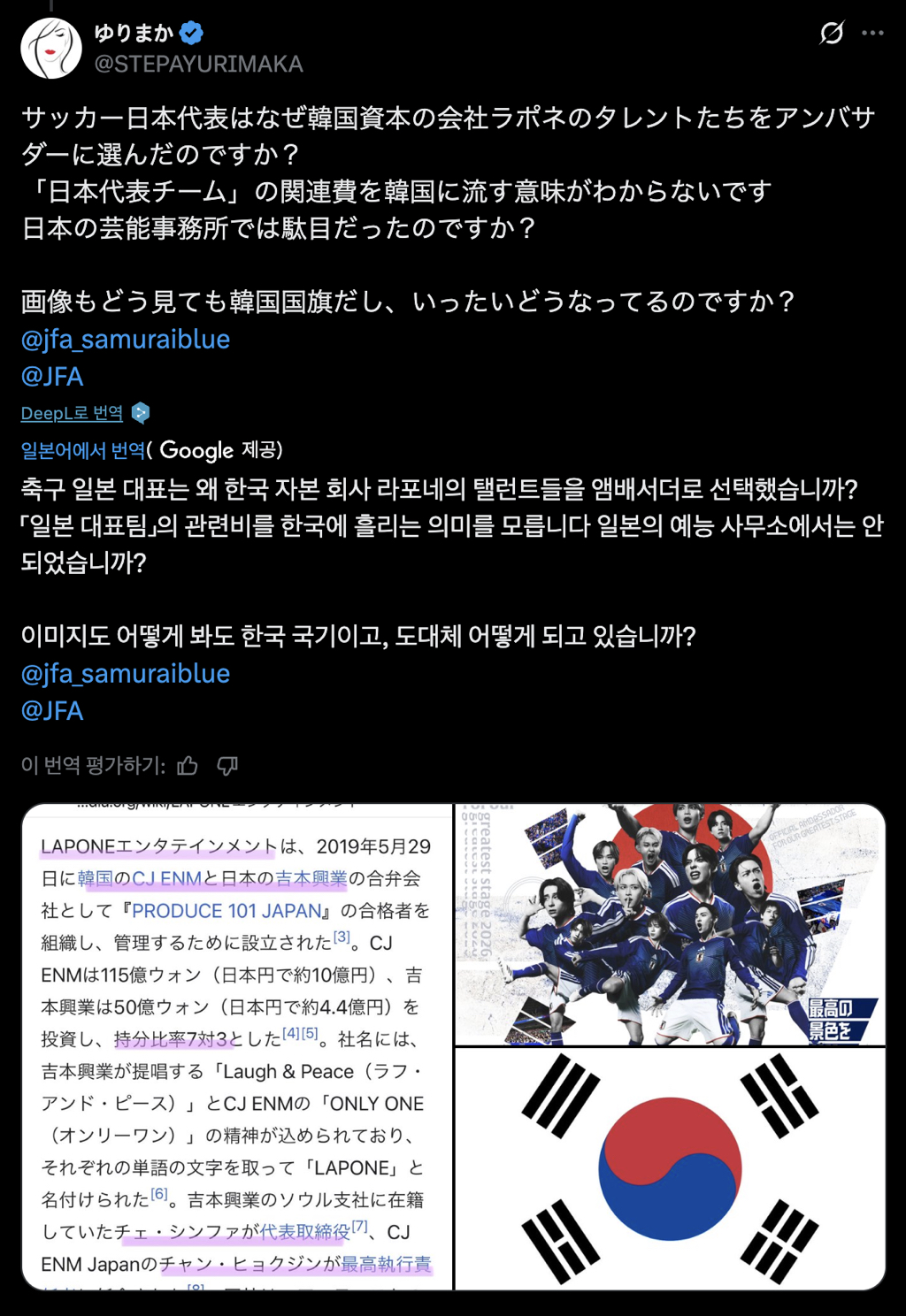 일본 국대 공식 앰배서더로 JI BLUE라는 아이돌 유닛이 임명됐는데 얘네 소속사가 CJ ENM이 지분 70% 가진 산하 레이블임