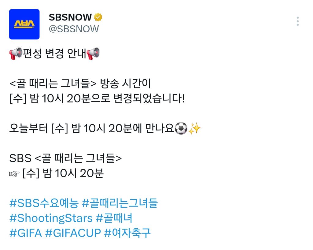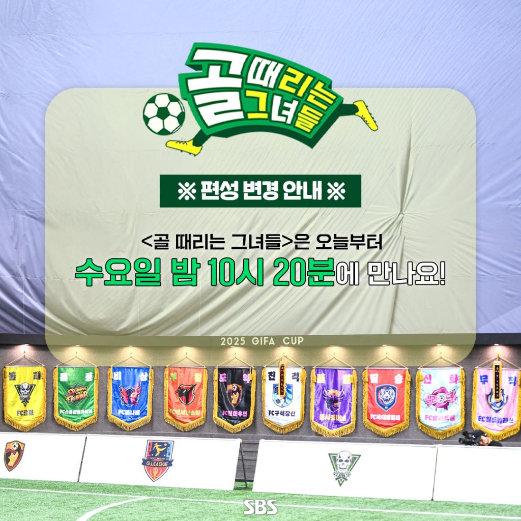 [방송]오늘부터 방송 시간이 변경될 SBS 예능 <골 때리는 그녀들>.jpg 작성자김지우|작성시간25.11.12|조회수3,221 목록 댓글 8 글자크기 작게가 글자크기 크게가 다음검색 현재 게시글 추가 기능 열기 북마크 공유하기 신고 센터로 신고 댓글 댓글 8 댓글쓰기 답글쓰기 댓글 리스트 작성자야리꾸리 | 작성시간 25.11.12 골때녀 나솔 루트가 좋았는데 작성자No.25 최철순 | 작성시간 25.11.12 골때녀 보고 퀵vod로 나솔 보는데.. 작성자수원블 | 작성시간 25.11.12 유퀴즈를 피하고 나솔을 선택 작성자SPECIAL | 작성시간 25.11.12 너무늦게하네ㅡㅡ 작성자I.B.I LUV | 작성시간 25.11.12 드라마에 밀리는구나...... 끝날듯...... 댓글 전체보기