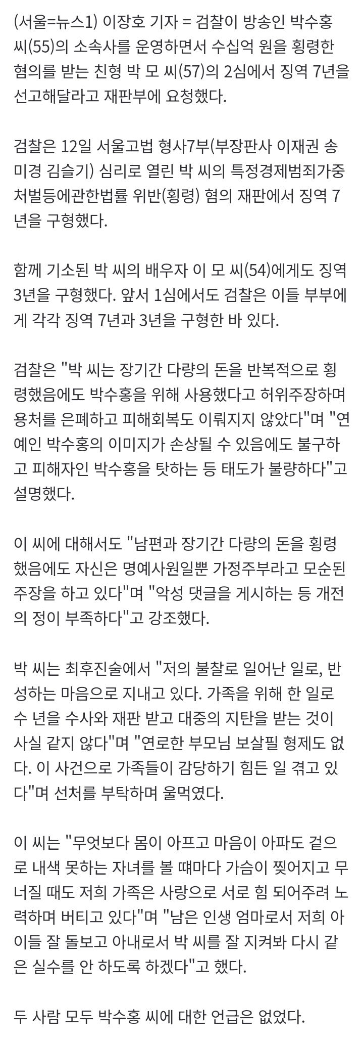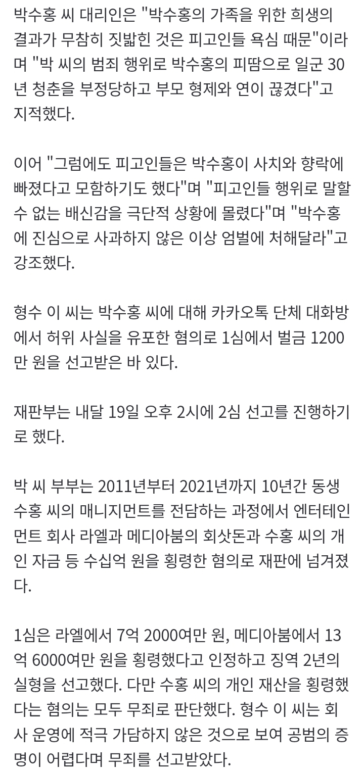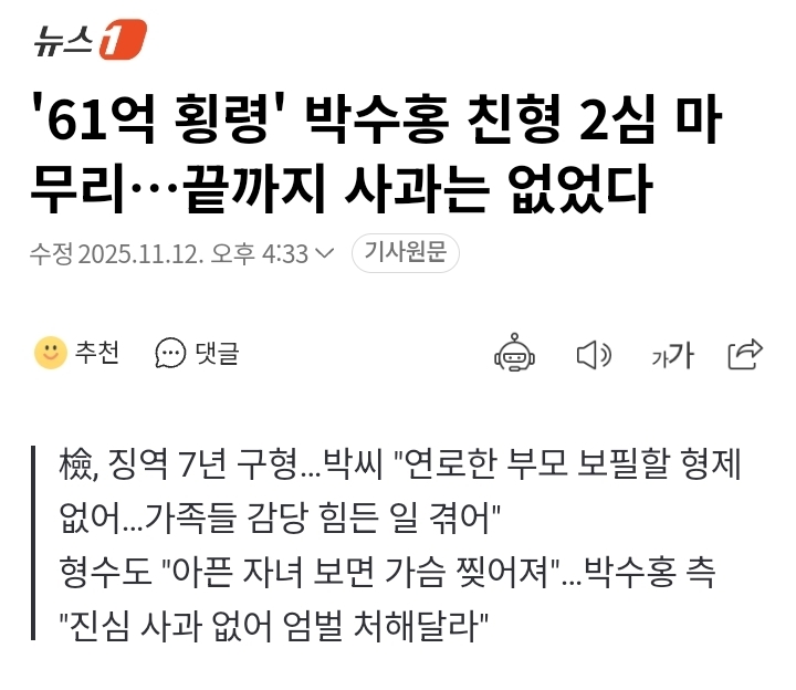 [기사]'61억 횡령' 박수홍 친형 2심 마무리…끝까지 사과는 없었다.gisa 작성자강동구주민 3|작성시간25.11.12|조회수10,889 목록 댓글 12 글자크기 작게가 글자크기 크게가 '61억 횡령' 박수홍 친형 2심 마무리…끝까지 사과는 없었다검찰이 방송인 박수홍 씨(55)의 소속사를 운영하면서 수십억 원을 횡령한 혐의를 받는 친형 박 모 씨(57)의 2심에서 징역 7년을 선고해달라고 재판부에 요청했다. 검찰은 12일 서울고법 형사7부(부n.news.naver.com 다음검색 현재 게시글 추가 기능 열기 북마크 공유하기 신고 센터로 신고 댓글 댓글 12 댓글쓰기 답글쓰기 댓글 리스트 작성자슈팅라이크종수 | 작성시간 25.11.12 개같네 작성자H_Crespo | 작성시간 25.11.12 으휴 ㅉㅉ 작성자스마일리 | 작성시간 25.11.12 저큰돈이 어디서 나온지보면 되는거 아닌가 ?? 박수홍이 번돈이잖아. 작성자I.B.I LUV | 작성시간 25.11.12 정신 못 차렸네.. 저리 불량함으로 일관하는데 감형은 없겠지??? 작성자이나경 | 작성시간 25.11.13 고작 7년... 댓글 전체보기