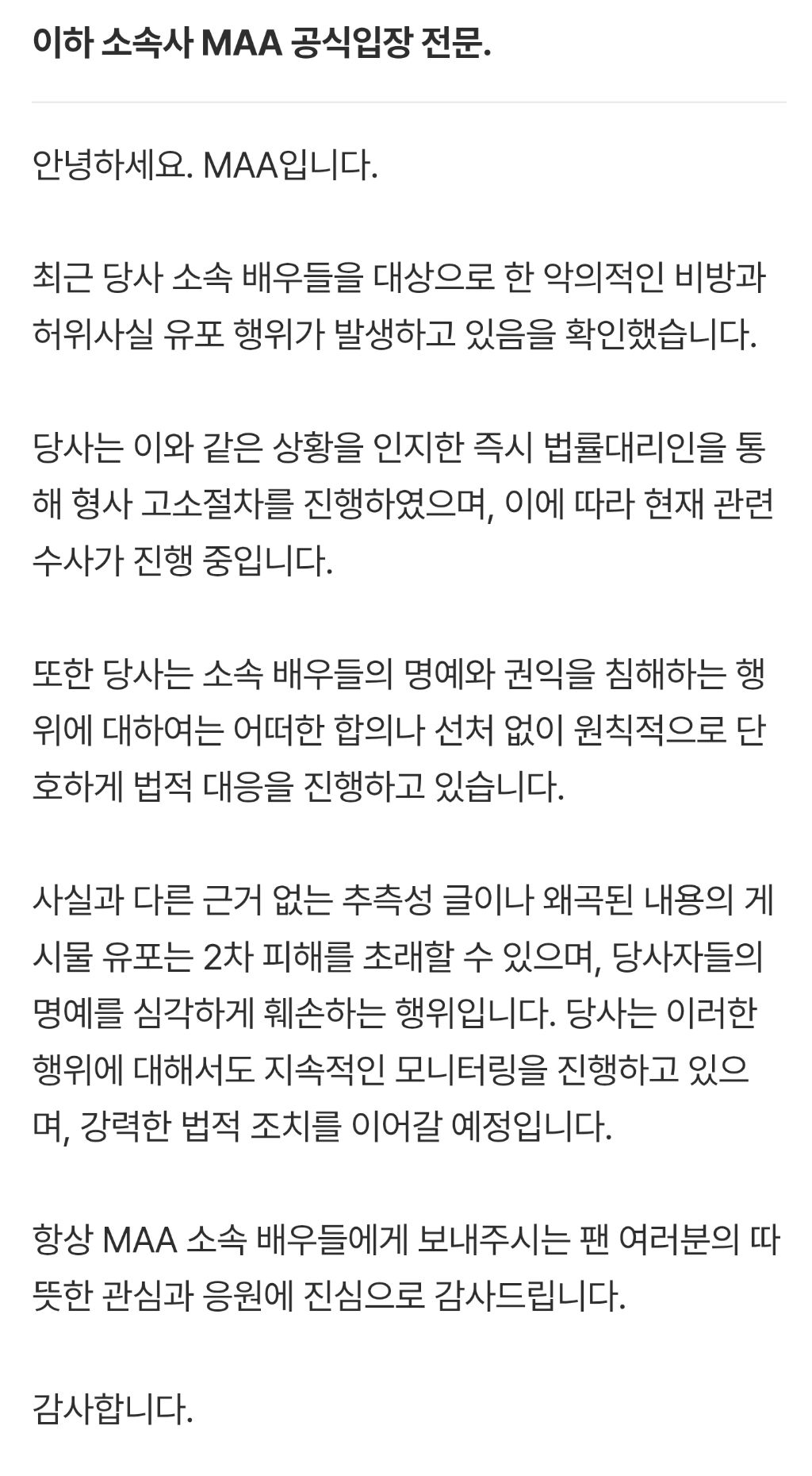 작성자Goyounjung 작성시간 25.11.12 앞서 한 네티즌은 MAA에 대한 폭로글을 게시했으며 해당 글은 빠르게 확산됐다. 이 네티즌은 "엔터업에 있는 노동자들의 위한 공익성 제보"라면서 "노동자들을 대표해서 엔터 체계의 불합리함을 세상에 알리는것에 목적을 두겠다"라고 말문을 열었다. 이어 이 네티즌은 MAA 측이 직원들의 인권을 유린했으며 노동을 착취했다고 주장했다. 또한 특정 배우들을 언급하며 MAA가 일부 수익금을 횡령했다는 의혹을 제기했다.