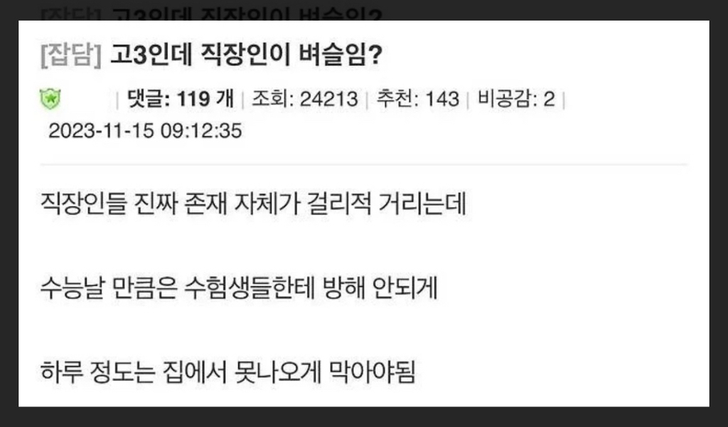 고3인데 직장인이 벼슬임? 작성자인천서포터즈|작성시간25.11.13|조회수8,159 목록 댓글 26 글자크기 작게가 글자크기 크게가 다음검색 현재 게시글 추가 기능 열기 북마크 공유하기 신고 센터로 신고 댓글 댓글 26 댓글쓰기 답글쓰기 댓글 리스트 작성자아메리카노 | 작성시간 25.11.13 오호 작성자jjoonee | 작성시간 25.11.13 나 고3인데 이말 맞다 작성자최철순 | 작성시간 25.11.13 ???: 너무 원하시므로 수능일은 무급휴일로 지정하겠읍니다? 작성자Andrey arshavin | 작성시간 25.11.13 제발 작성자ManUtd No.7 | 작성시간 25.11.13 자의가 아니라네 ㅠㅠ 댓글 전체보기