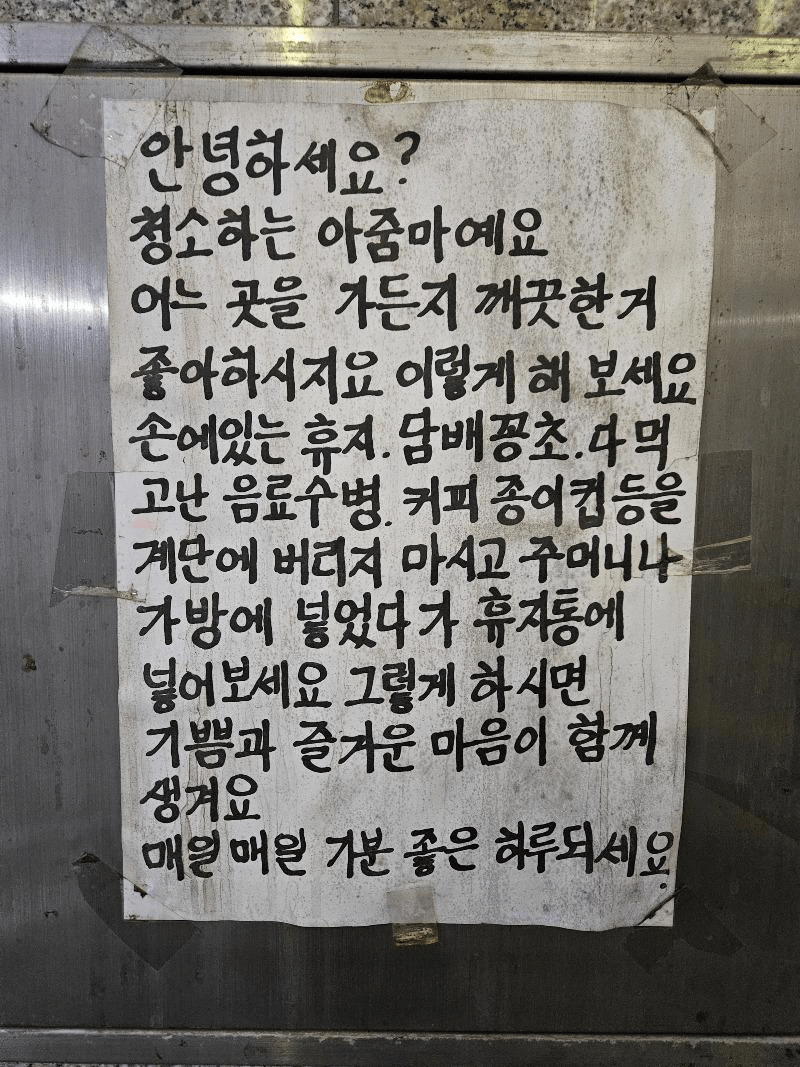 [기타]어느 환경 미화원님께서 붙여 놓으셨다는 대자보 작성자음교수2|작성시간25.11.13|조회수19,076 목록 댓글 3 글자크기 작게가 글자크기 크게가 다음검색 현재 게시글 추가 기능 열기 북마크 공유하기 신고 센터로 신고 댓글 댓글 3 댓글쓰기 답글쓰기 댓글 리스트 작성자아모링링 | 작성시간 25.11.13 글이랑 글씨 너무 잘쓰신다그리고 저것들 다 어렸을때부터 배워온 기본적인 것들인데.. 작성자서초패왕 항우 | 작성시간 25.11.13 저런 사람들 마인드 : 어차피 미화원들이 다 치워주는 거 아님? 답댓글 작성자에당아짜루 | 작성시간 25.11.13 ㄹㅇ 지 일하기 싫어서 이런거 써놨네 ㅇㅈㄹ 할듯 댓글 전체보기