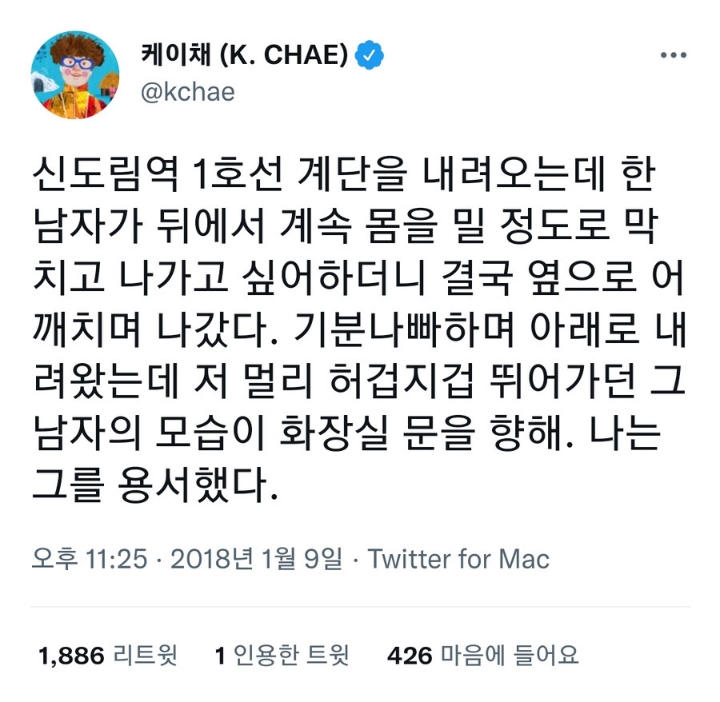 1호선 신도림역 어깨빵남 작성자Mikel Arteta Amatriain|작성시간25.11.13|조회수8,675 목록 댓글 13 글자크기 작게가 글자크기 크게가 다음검색 현재 게시글 추가 기능 열기 북마크 공유하기 신고 센터로 신고 댓글 댓글 13 댓글쓰기 답글쓰기 댓글 리스트 답댓글 작성자Mikel Arteta Amatriain 작성자 본인 여부 작성자 | 작성시간 25.11.13 ㅋㅋㅋ 맞아요 저 사람은 저러는동안 어떤 싸움을 해온걸까 지하철에서.. 작성자마이너스템포 | 작성시간 25.11.13 아 급똥ㅋㅋ 작성자SOWON | 작성시간 25.11.13 ㅋㅋㅋㅋㅋㅋ 작성자민류이 | 작성시간 25.11.13 근데 화장실이 꽉 찼다면... 작성자I.B.I LUV | 작성시간 25.11.13 저건 이해해줌 ㅋㅋㅋㅋㅋ 댓글 전체보기