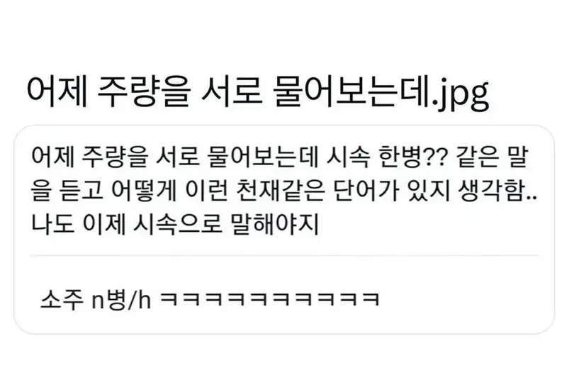 주량이 어떻게 되세요? 작성자러바오|작성시간25.11.15|조회수2,496 목록 댓글 5 글자크기 작게가 글자크기 크게가 다음검색 현재 게시글 추가 기능 열기 북마크 공유하기 신고 센터로 신고 댓글 댓글 5 댓글쓰기 답글쓰기 댓글 리스트 작성자모과차 | 작성시간 25.11.15 이야 말 되네 작성자광배근 | 작성시간 25.11.15 ㅋㅋㅋ 시속 반병 좋네요 작성자Madrid | 작성시간 25.11.15 시속 2병으로 2시간 먹고 기절가능 작성자Tensegrity Universe and Philosophy | 작성시간 25.11.15 유량 개념의 주량이네 ㅋㅋㅋ전 시속 맥주 두컵 작성자이천이십이 | 작성시간 25.11.15 오 천재 댓글 전체보기