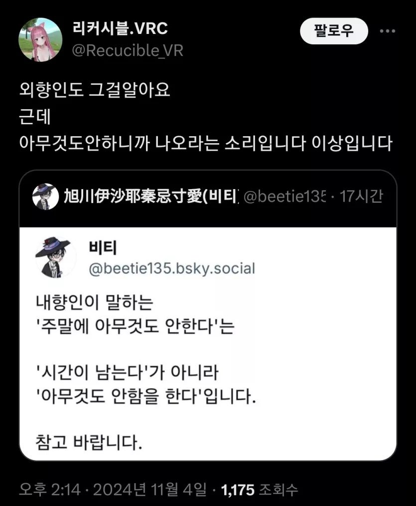작성자Tensegrity Universe and Philosophy 작성시간 25.11.15 내향인에게 집에 있는게 아무것도 안함이 아니지. 서로 함/안함에 대한 정의가 다르니 어긋날 수 밖에
