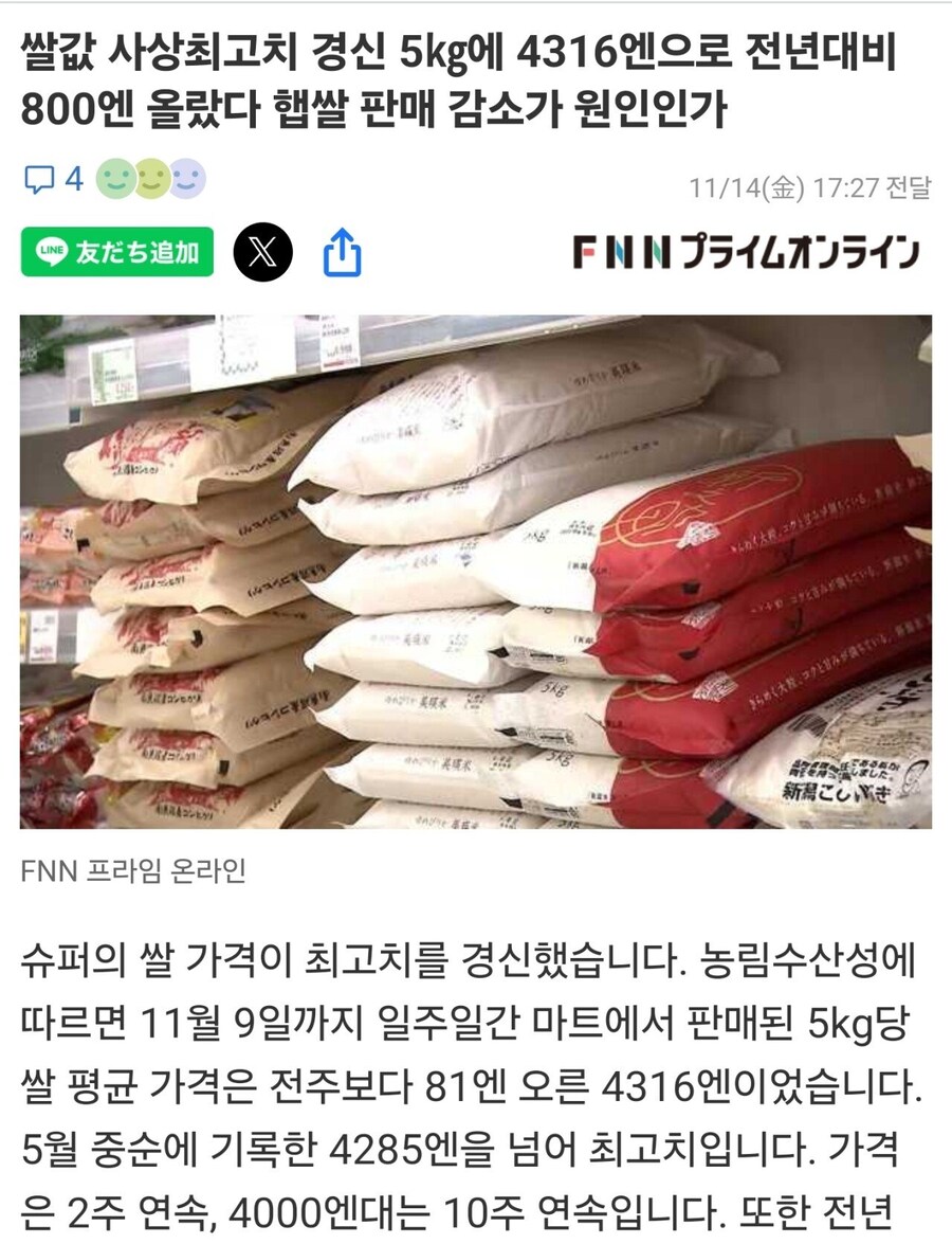 일본 쌀값 근황.jpg 작성자삼베옷|작성시간25.11.15|조회수8,124 목록 댓글 3 글자크기 작게가 글자크기 크게가 비축미 방출로 쌀값이 떨어졌다가비축미 판매량 줄면서 쌀값 다시 오르더니 역대 최고치 경신 다음검색 현재 게시글 추가 기능 열기 북마크 공유하기 신고 센터로 신고 댓글 댓글 3 댓글쓰기 답글쓰기 댓글 리스트 작성자디자이너 | 작성시간 25.11.15 물론 품질마다 다르겠지만 우리는 1.5~2.5만원 허니까최소 두배비싸네요 작성자행교 | 작성시간 25.11.15 개비싸네 작성자오이는빼고주세요 | 작성시간 25.11.15 올해 일본 역대급 풍년이라던데.. 가격이.. 댓글 전체보기