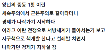ㄴ 일단 이란은 중동이 아니고 경제도 나름 자급자족 원할하고 무엇보다 세계 어느 나라 눈치 안보고 맘에 안들면 선빵 치는 나라임.
