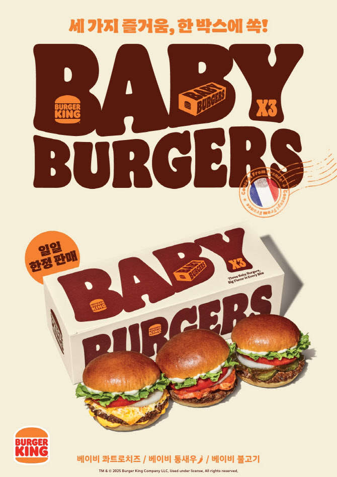 [음식]버거킹 신메뉴 베이비 버거 출시 작성자서울스날|작성시간25.11.17|조회수10,426 목록 댓글 9 글자크기 작게가 글자크기 크게가 콰트로치즈·통새우·불고기 베이비 3종 한 세트 구성단품 10,900 세트 13,900 다음검색 현재 게시글 추가 기능 열기 북마크 공유하기 신고 센터로 신고 댓글 댓글 9 댓글쓰기 답글쓰기 댓글 리스트 작성자광배근 | 작성시간 25.11.17 설마 마카롱 만한건 아니겠지? ㄷㄷ 작성자Gillian | 작성시간 25.11.17 토마토슬라이스 사이즈로 유추해보면 진짜 핑거푸드인데 작성자쓰루패스 | 작성시간 25.11.17 빠바 햄버거크기정도 할듯 답댓글 작성자마율루 | 작성시간 25.11.17 22 작성자Tensegrity Universe and Philosophy | 작성시간 25.11.17 주니어가 베이비라고 생각했는데... 그럼 저건 피러스 인가 댓글 전체보기