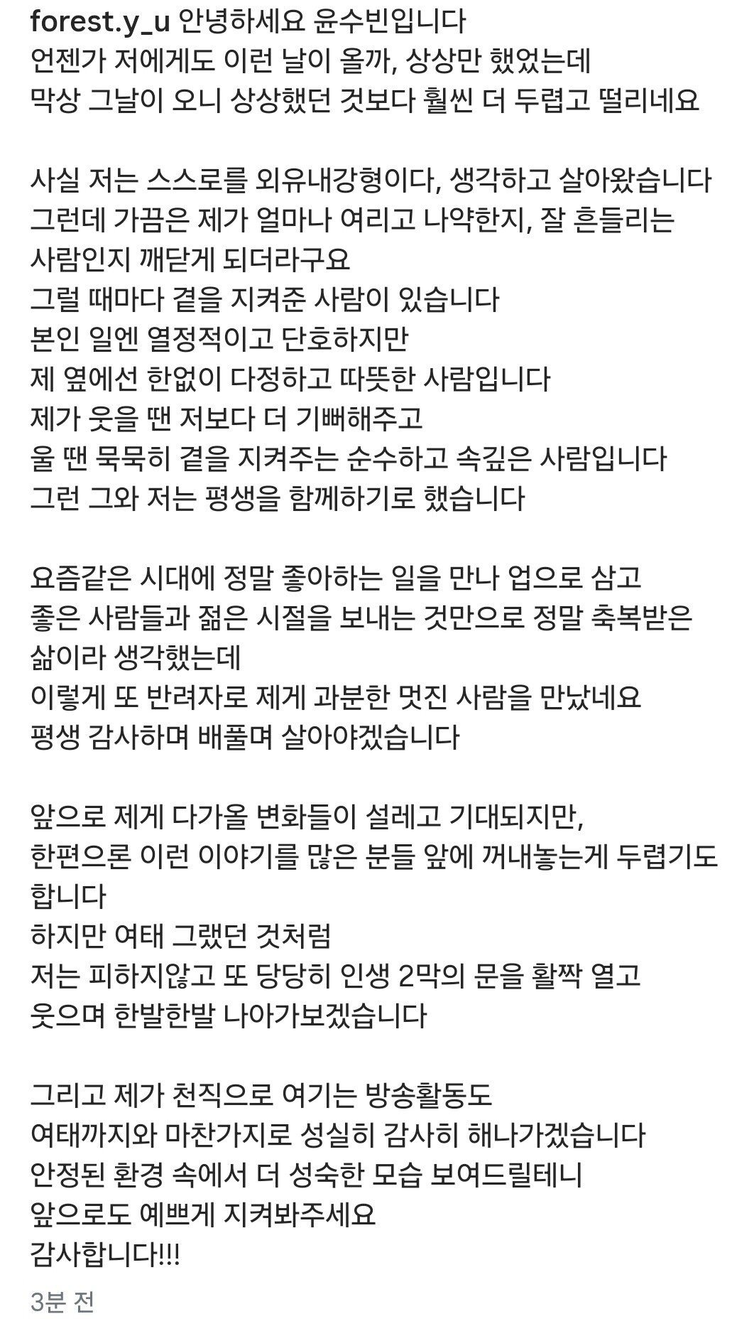 윤수빈 아나운서 결혼 발표 작성자박규영|작성시간25.11.17|조회수7,138 목록 댓글 10 글자크기 작게가 글자크기 크게가 다음검색 현재 게시글 추가 기능 열기 북마크 공유하기 신고 센터로 신고 댓글 댓글 10 댓글쓰기 답글쓰기 댓글 리스트 작성자tnatropmI | 작성시간 25.11.17 ㅊㅋㅊㅋ 작성자버츠비 | 작성시간 25.11.17 ㄷㄷㄷ 작성자마이너스템포 | 작성시간 25.11.17 우왕ㅊㅋㅊㅋ 작성자Andrey arshavin | 작성시간 25.11.17 ㅊㅊㅊㅊㅊㅊ 작성자SOWON | 작성시간 25.11.17 ㅊㅋㅊㅋ 댓글 전체보기