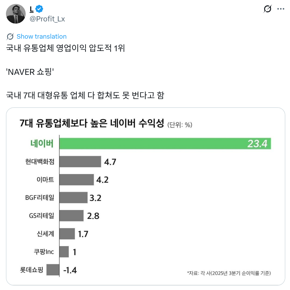 거래대금 총액이 쿠팡이랑 네이버가 독보적인 투톱이고 1년에 50조 정도로 비등비등한데 쿠팡이 직매입이라 이익이 셈. 쿠팡이랑 네이버가 우니나라 이커머스 절반 거래한다고 보면 됨.