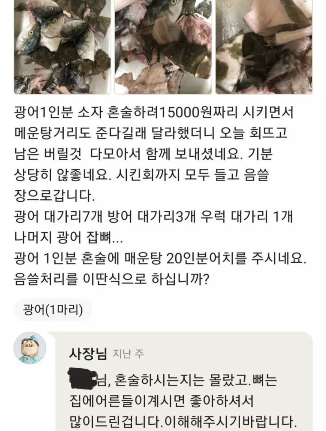 답댓글 작성자Dennis Cirkin 작성시간 25.11.19 저건 대놓고 음쓰 처리한거죠. 서비스 매운탕 거리 준다하고 저렇게 주는 집이 어딨습니까