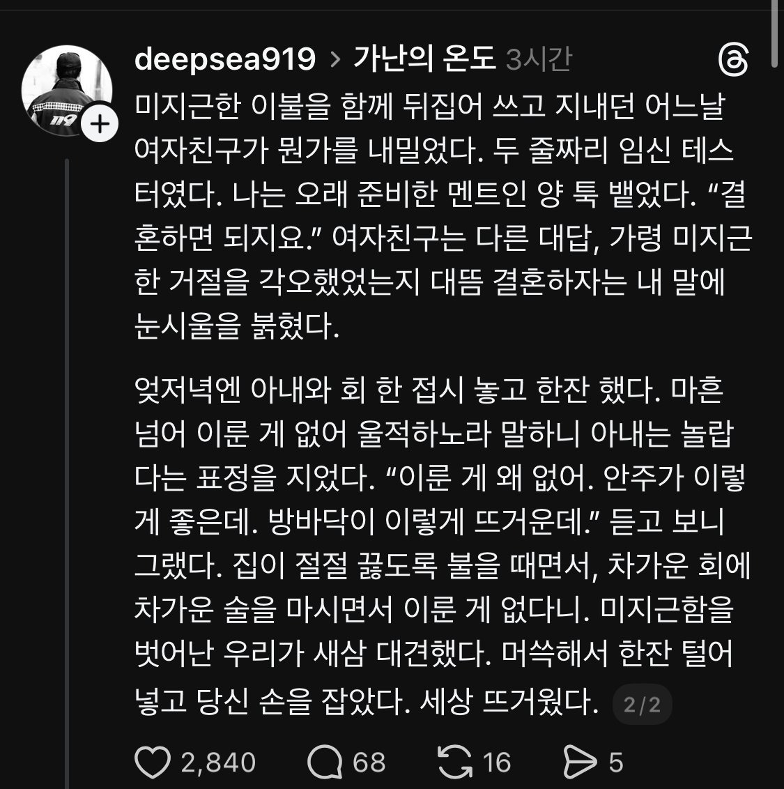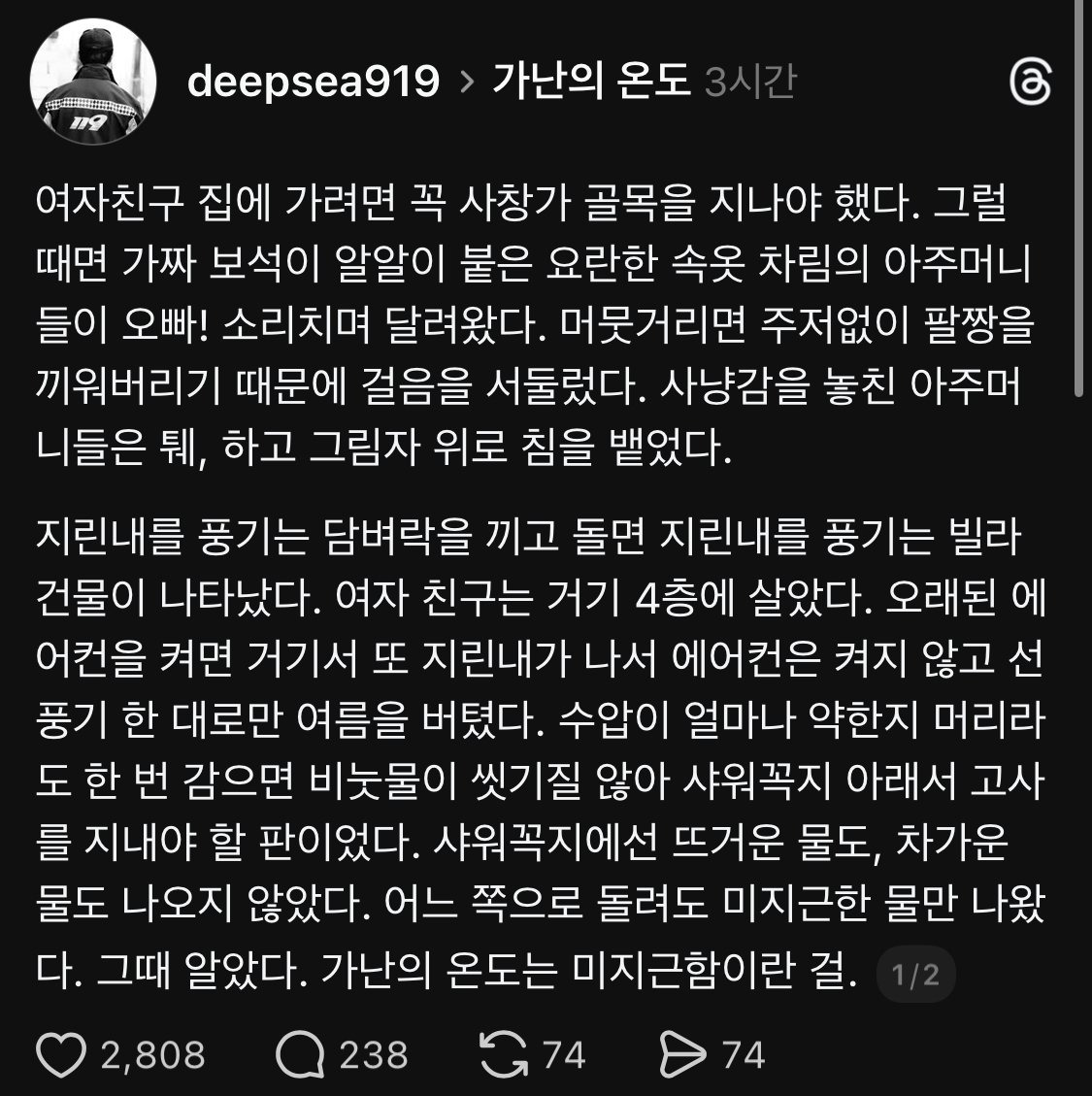 [SNS]가난의 온도 작성자음교수2|작성시간25.11.20|조회수11,631 목록 댓글 16 글자크기 작게가 글자크기 크게가 다음검색 현재 게시글 추가 기능 열기 북마크 공유하기 신고 센터로 신고 댓글 댓글 16 댓글쓰기 답글쓰기 댓글 리스트 작성자순수했던청년 | 작성시간 25.11.20 아 좋다 작성자경찰청장 | 작성시간 25.11.20 차가운 안주에 뜨거운 바닥..가난한건 내 행복이 아닐지 답댓글 작성자Vicario | 작성시간 25.11.20 청장님...명필이시네... 작성자Arsenal No.1 | 작성시간 25.11.20 따뜻해 작성자트렌트 알렉산더 아놀드66 | 작성시간 25.11.20 ㅠㅠㅠㅠㅠㅠ 댓글 전체보기