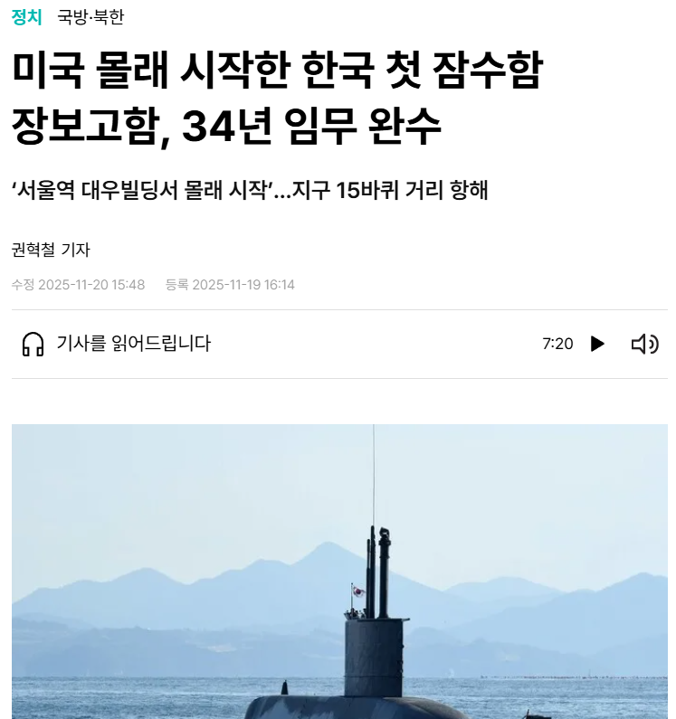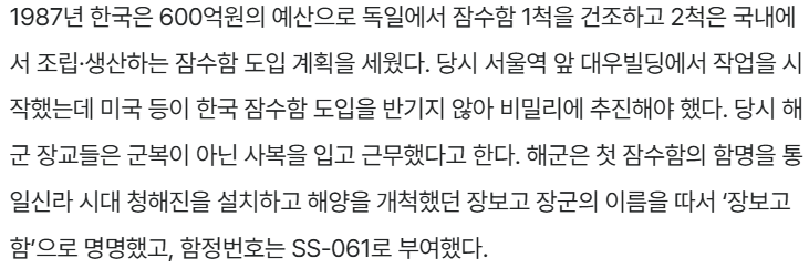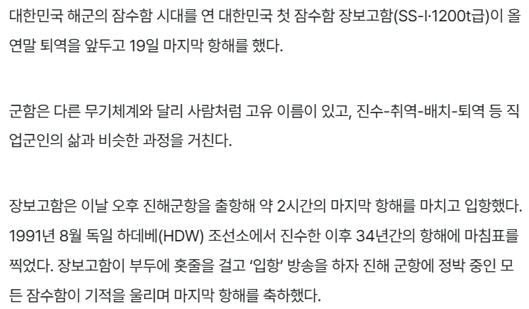 [기사]한국 첫 잠수함 장보고함, 34년 임무 완수 작성자인조인간 17호|작성시간25.11.20|조회수2,972 목록 댓글 4 글자크기 작게가 글자크기 크게가 미국 몰래 시작한 한국 첫 잠수함 장보고함, 34년 임무 완수 다음검색 현재 게시글 추가 기능 열기 북마크 공유하기 신고 센터로 신고 댓글 댓글 4 댓글쓰기 답글쓰기 댓글 리스트 작성자치타 | 작성시간 25.11.20 차기 장보고함은 언제 취역하려나 답댓글 작성자취미요리 | 작성시간 25.11.20 핵잠으로 하지 않을ㄲ............ 답댓글 작성자개깡이주인 | 작성시간 25.11.20 아토믹 장보고 대왕기대중 ㅋㅋㅋㅋㅋ 작성자닥털 | 작성시간 25.11.20 물자로 저장되나? 아님 동맹국에 공여 할라나? 댓글 전체보기