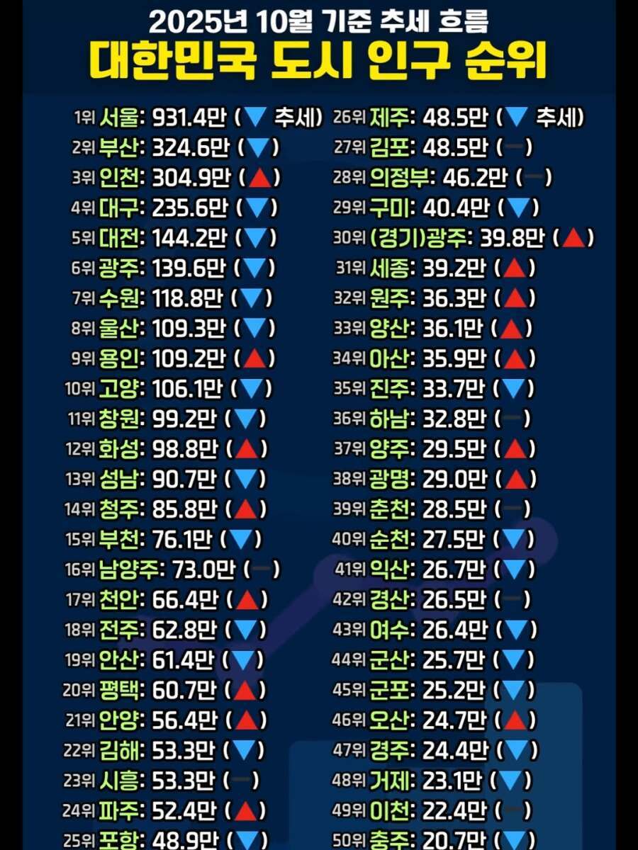대한민국 도시 인구 순위 (올해 10월 기준) 작성자ChatGPT|작성시간25.11.20|조회수21,552 목록 댓글 8 글자크기 작게가 글자크기 크게가 다음검색 현재 게시글 추가 기능 열기 북마크 공유하기 신고 센터로 신고 댓글 댓글 8 댓글쓰기 답글쓰기 댓글 리스트 작성자치타 | 작성시간 25.11.20 수원 줄었네 작성자오스먼트 | 작성시간 25.11.20 인천 상승 ㄷㄷ 작성자프리미에르 | 작성시간 25.11.20 화성 100만 넘었는데 외국인 미포함인건가 작성자소소비2 | 작성시간 25.11.20 심각하네 작성자닉넴뭐로할까요 | 작성시간 25.11.20 전주 65만깨졌구나ㄷㄷ 댓글 전체보기