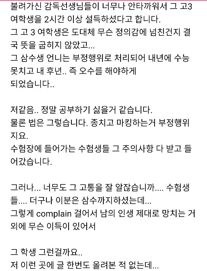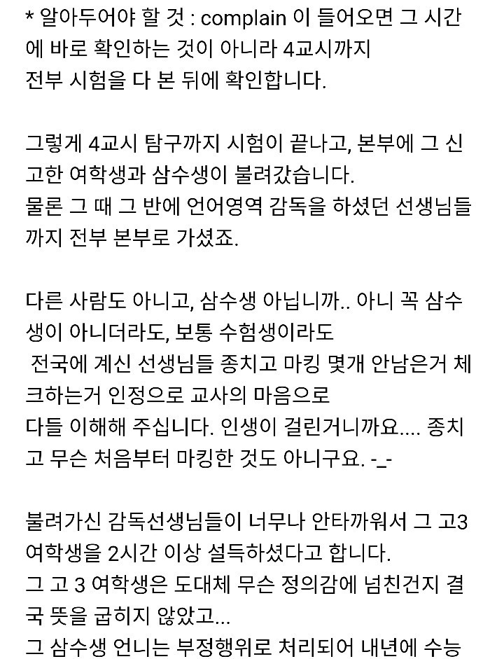작성자조손 작성시간 25.11.21 이해는 된다만 저거 그냥 넘어가면 감독했던 선생님들까지 불똥 튈수도있는지라