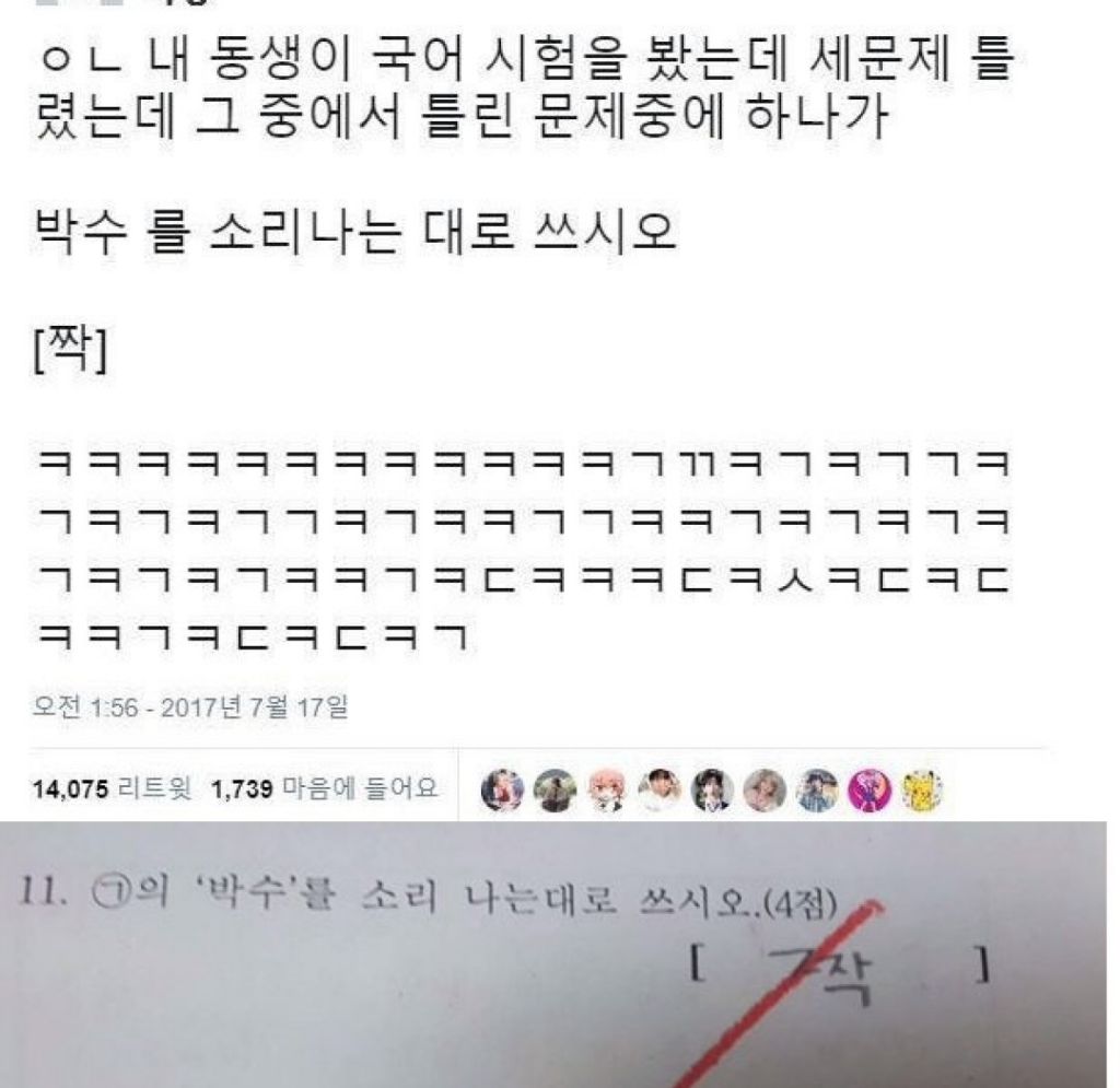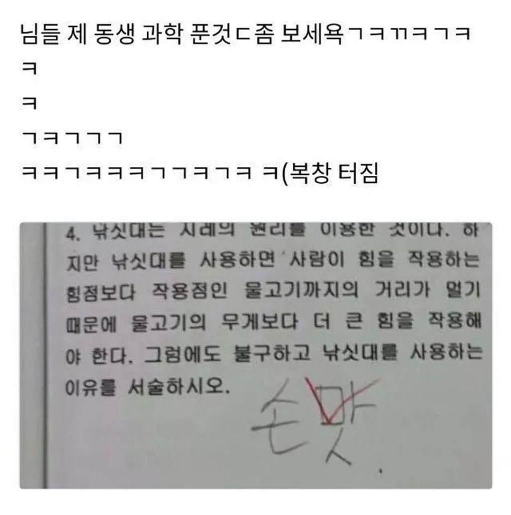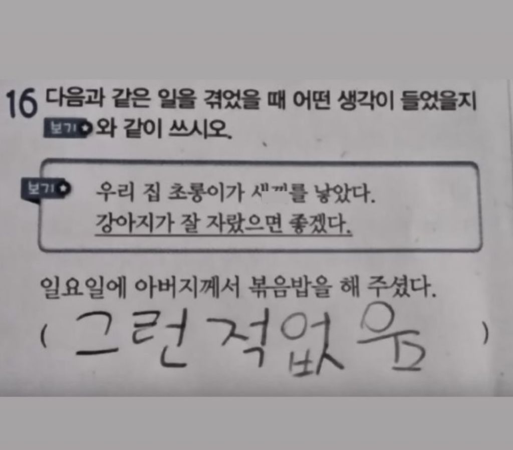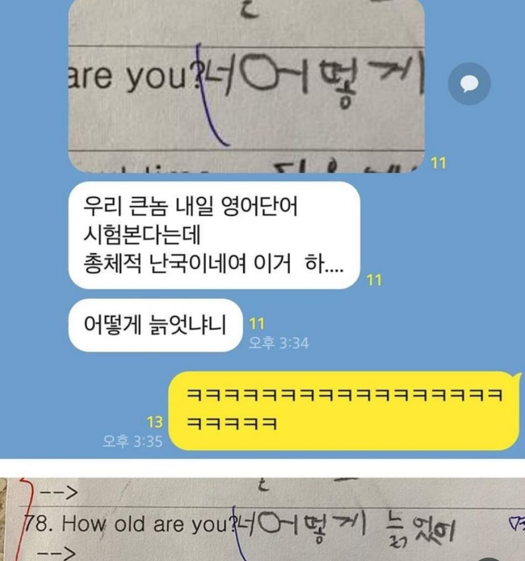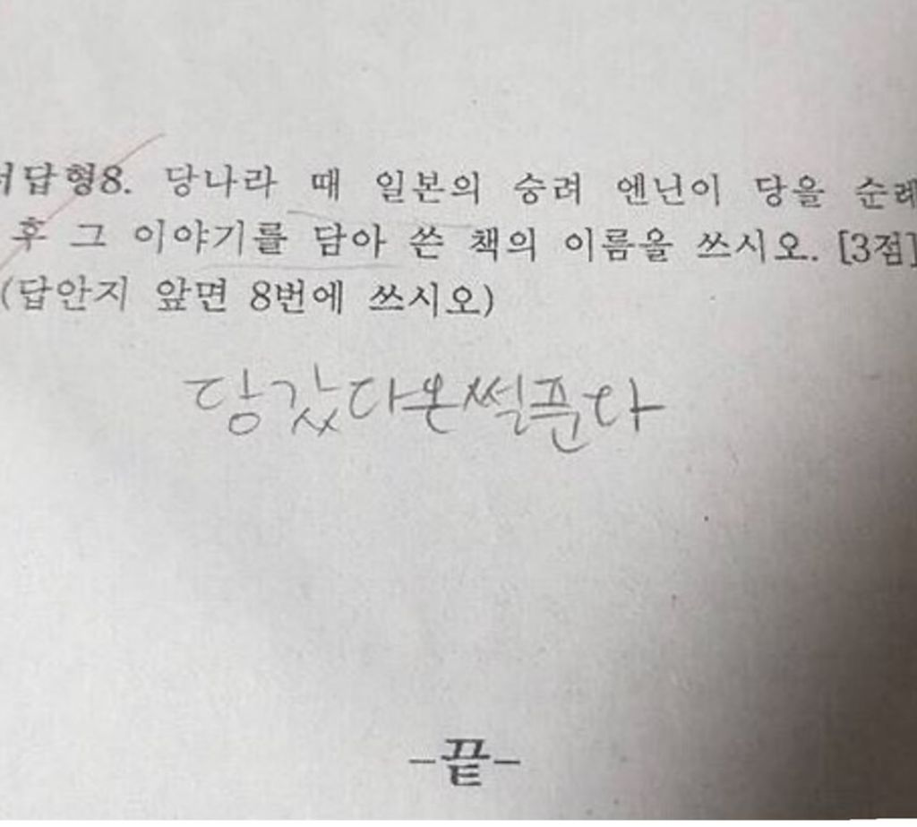 동생 영어시험 보고 왔는데 얘 어떡하냐? 작성자러바오|작성시간25.11.21|조회수7,126 목록 댓글 10 글자크기 작게가 글자크기 크게가 다음검색 현재 게시글 추가 기능 열기 북마크 공유하기 신고 센터로 신고 댓글 댓글 10 댓글쓰기 답글쓰기 댓글 리스트 작성자데이빗베컴이 | 작성시간 25.11.21 아앀ㅋㅋㅋㅋㅋ회의전에 보다가 터질뻔ㅋㅋㅋㅋ 작성자fromis_9 장규리 | 작성시간 25.11.21 개웃기네 ㅋㅋㅋㅋㅋㅋㅋㅋㅋㅋㅋㅋㅋ 작성자Fred | 작성시간 25.11.21 ㅋㅋㅋㅋㅋㅋㅋ 작성자팰리세이드 | 작성시간 25.11.21 아 개웃기네 작성자I.B.I LUV | 작성시간 25.11.21 골 때리네 ㅋㅋㅋㅋㅋㅋㅋ 댓글 전체보기