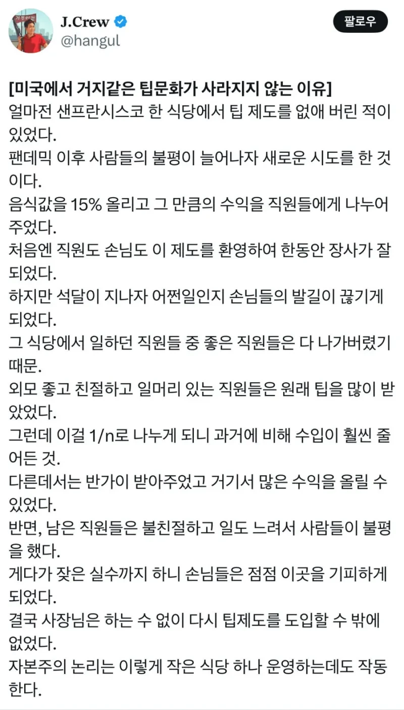 작성자나다 작성시간 25.11.21 팁 방식에서 변화를 원했으면 직원관리를 좀 더 했어야 하지 않나 싶은데요
