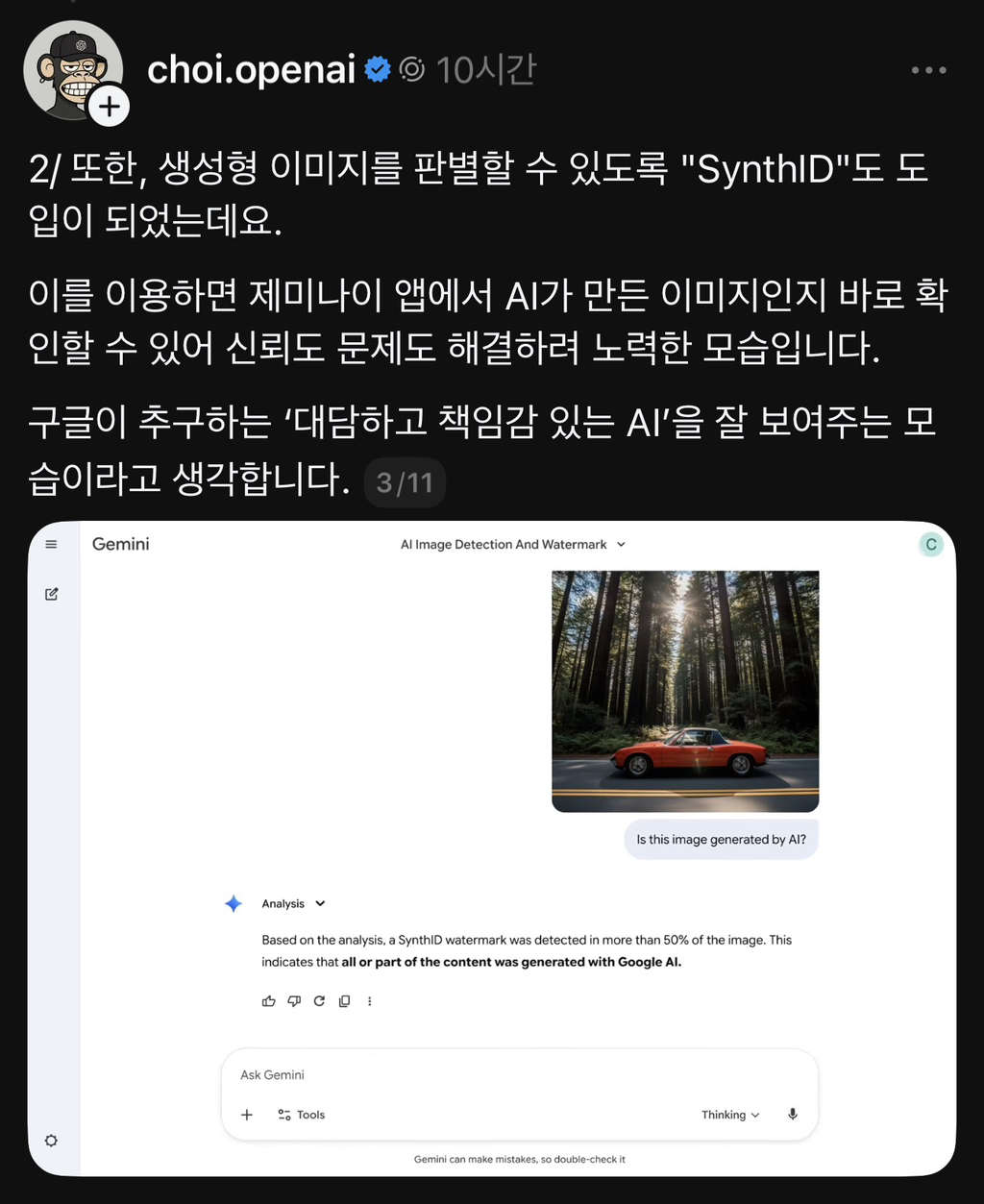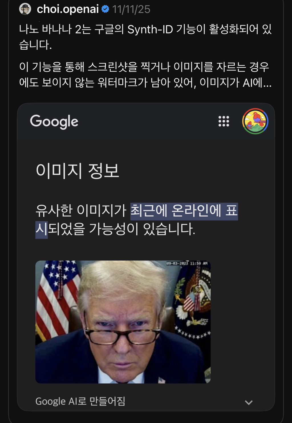 구글, 제미나이에 AI가 만든 이미지인지 식별하는 기능 추가 작성자Google|작성시간25.11.21|조회수3,086 목록 댓글 4 글자크기 작게가 글자크기 크게가 https://www.threads.com/@choi.openai/post/DRRdNYnkQwm?xmt=AQF0jVwR9KTI6-bEeDR1VM2MIJHchVDltbLu0FFQTHJWX9zNyv3ouJDW0V_bDu0owy50ADc&slof=1 다음검색 현재 게시글 추가 기능 열기 북마크 공유하기 신고 센터로 신고 댓글 댓글 4 댓글쓰기 답글쓰기 댓글 리스트 작성자Eninho | 작성시간 25.11.21 이제 슬슬 ai 생성 콘텐츠는 ai 생성 컨텐츠임을 표시하는 걸 의무화 할 필요가 있지 않나 생각.. 답댓글 작성자엘사 | 작성시간 25.11.21 우리나라 기준 내년 1월 11일 시행 예정이에요 답댓글 작성자Alexis Sanchez | 작성시간 25.11.21 엘사 좋네요 답댓글 작성자Eninho | 작성시간 25.11.21 엘사 오 너무 좋네요 다행입니다 댓글 전체보기