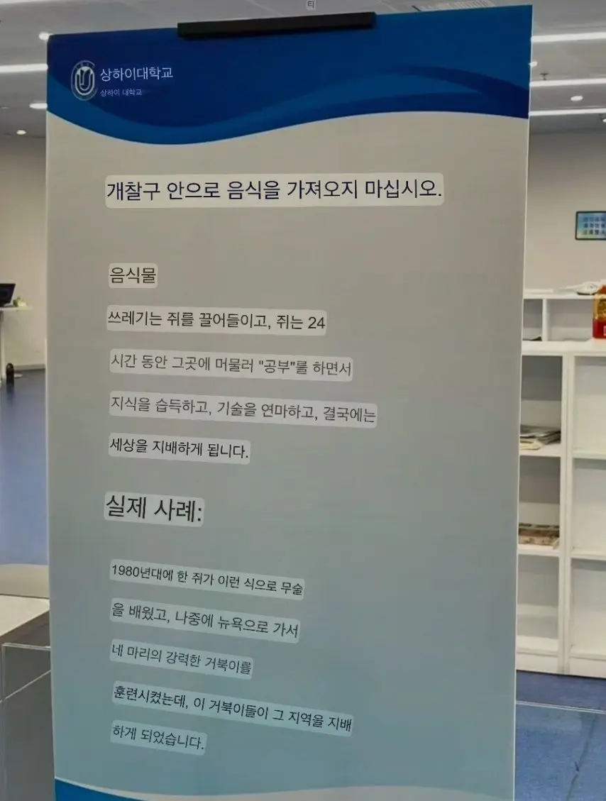 상하이 대학의 도서관 경고문구 작성자ChatGPT|작성시간25.11.21|조회수5,697 목록 댓글 2 글자크기 작게가 글자크기 크게가 트위스트 춤 추면서 들어오라는 문구가 아니였다니 ㄷㄷㄷ 다음검색 현재 게시글 추가 기능 열기 북마크 공유하기 신고 센터로 신고 댓글 댓글 2 댓글쓰기 답글쓰기 댓글 리스트 작성자Tensegrity Universe and Philosophy | 작성시간 25.11.21 센스 있네요 ㅋㅋ 작성자슈팅라이크종수 | 작성시간 25.11.21 ㅋㅋㅋㅋㅋ 댓글 전체보기
