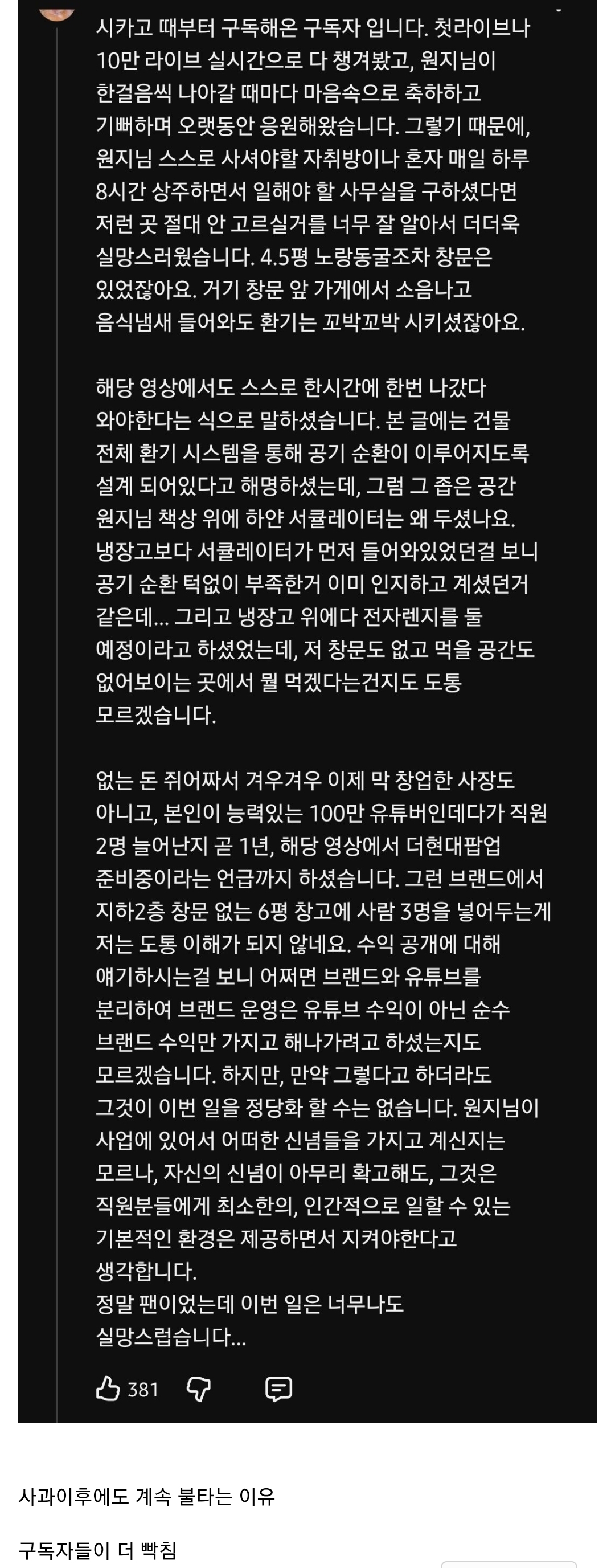 작성자Dennis Cirkin 작성시간 25.11.23 걍 영상으로 남기지 말지.. 결국에 저런 반응이 나올 수 밖에 없지 않나 싶어요. 그냥 사무실 내고 휴게시간 충분히 주고 잘 운영했으면 말고 안나오고 아무 사건이 아니었을텐데