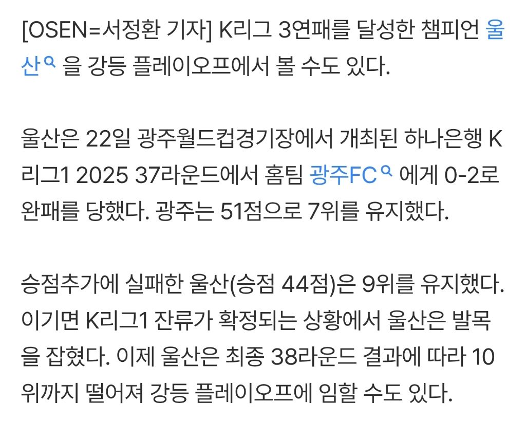 [축구기사]‘천하의 K리그 3연패 챔피언 울산’ 강등 PO에서 보나? 광주에 0-2 완패…최종전 결과 따라 10위 가능
