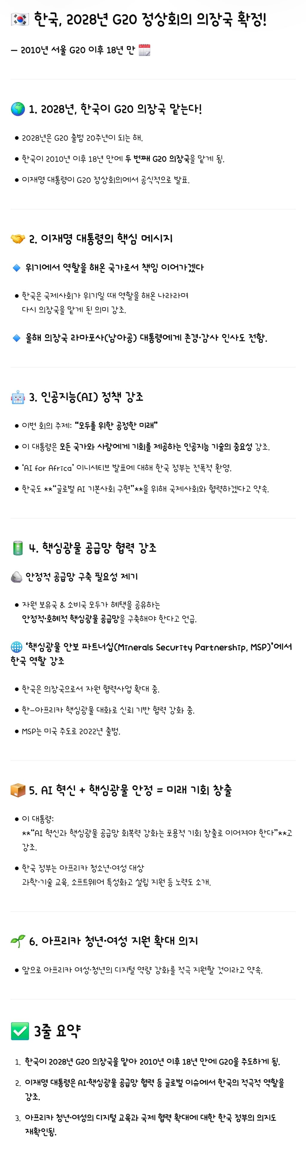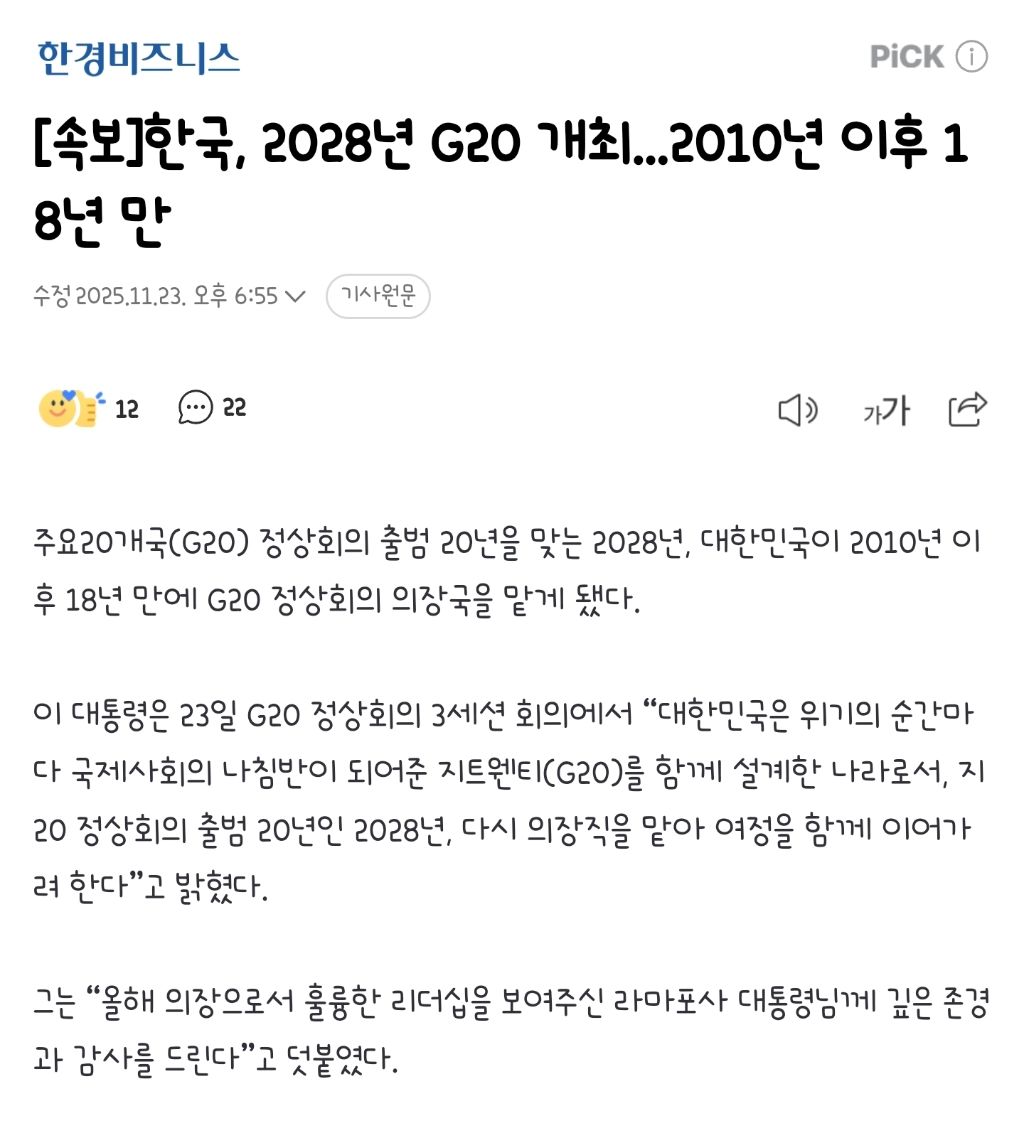 [기사][속보]한국, 2028년 G20 개최...2010년 이후 18년 만 작성자ChatGPT|작성시간25.11.23|조회수7,678 목록 댓글 12 글자크기 작게가 글자크기 크게가 출처: https://n.news.naver.com/article/050/0000098773?type=breakingnews&cds=news_my(중략)(기사 전문은 출처로)[요약]출처: https://n.news.naver.com/article/050/0000098773?type=breakingnews&cds=news_my 다음검색 현재 게시글 추가 기능 열기 북마크 공유하기 신고 센터로 신고 댓글 댓글 12 댓글쓰기 답글쓰기 댓글 리스트 작성자페더스 맥그로우 | 작성시간 25.11.23 작성자박상미 | 작성시간 25.11.23 ㅅㅅ 작성자쿠헤헤헤 | 작성시간 25.11.23 이명박이가 경제효과가 2천조라고 뻥쳤었던 것 같은데... 작성자치타 | 작성시간 25.11.23 캬ㅅㅅㅅ 작성자데쿠 | 작성시간 25.11.24 총선때네 댓글 전체보기