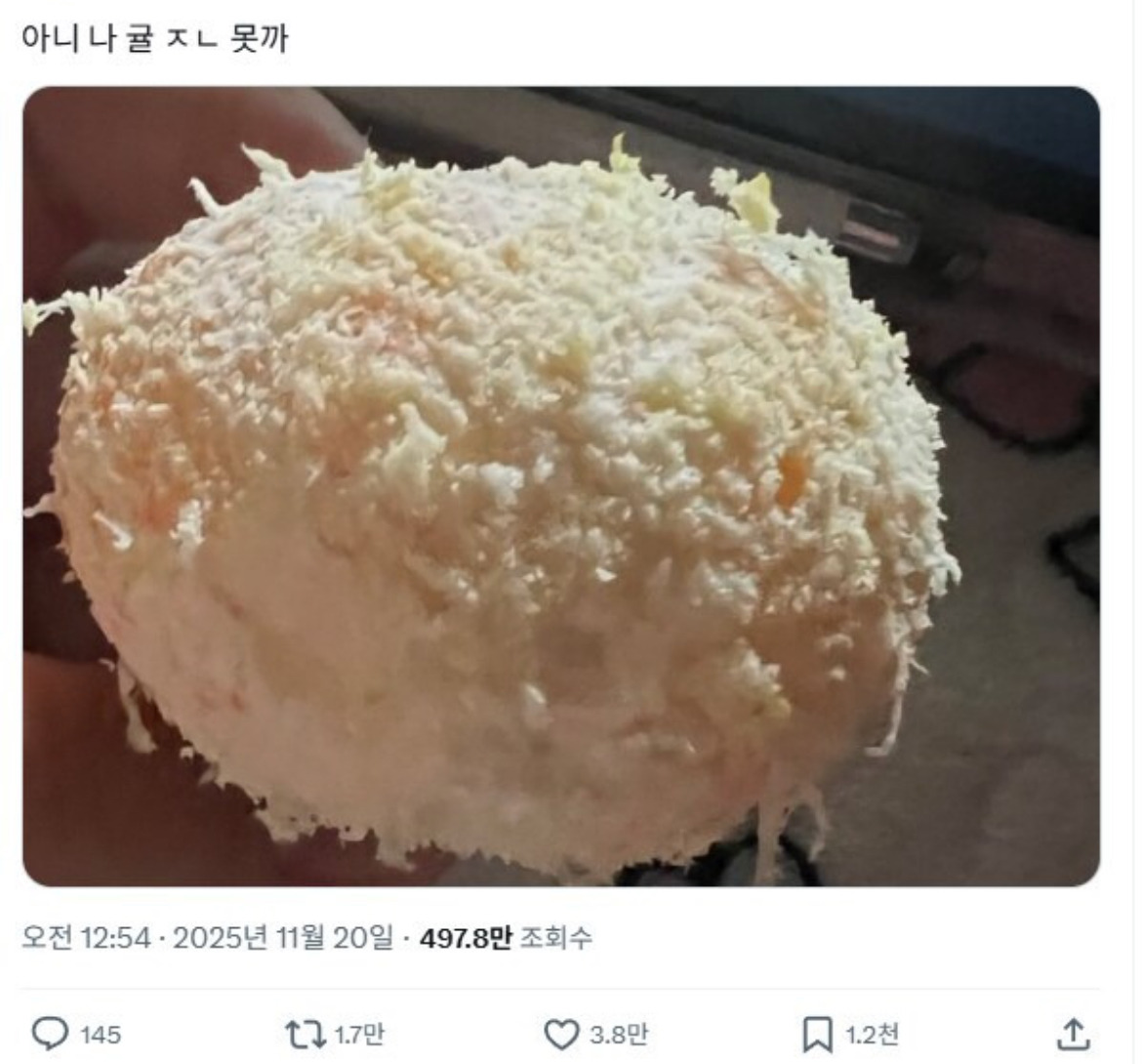 [유머]2025년 귤 못까기 대회 우승자 작성자몽키.D.루피|작성시간25.11.24|조회수4,772 목록 댓글 4 글자크기 작게가 글자크기 크게가 다음검색 현재 게시글 추가 기능 열기 북마크 공유하기 신고 센터로 신고 댓글 댓글 4 댓글쓰기 답글쓰기 댓글 리스트 작성자Barcelona | 작성시간 25.11.24 ㅋㅋㅋㅋㅋ 작성자Terry | 작성시간 25.11.24 이건 이렇게 까기도 힘들것같은데ㅋㅋㅋㅋㅋㅋㅋㅋ 작성자남산위 | 작성시간 25.11.24 예술 작품 아닌가요? ㅋㅋ 기니피그를 만들어 놨네 ㅋㅋ 작성자무무링 | 작성시간 25.11.24 이거 누가 ai가 휴먼을 이길 수 없는 이유라던데 ㅋㅋㅋ 댓글 전체보기