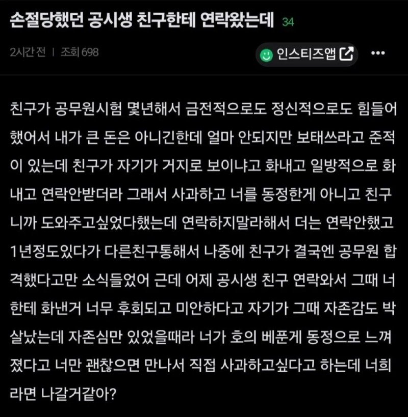 사과는 받아야지. 하지만 거기까지 일듯. 그 친구의 바닥을 봤으니 깊이 지내긴 힘들듯.