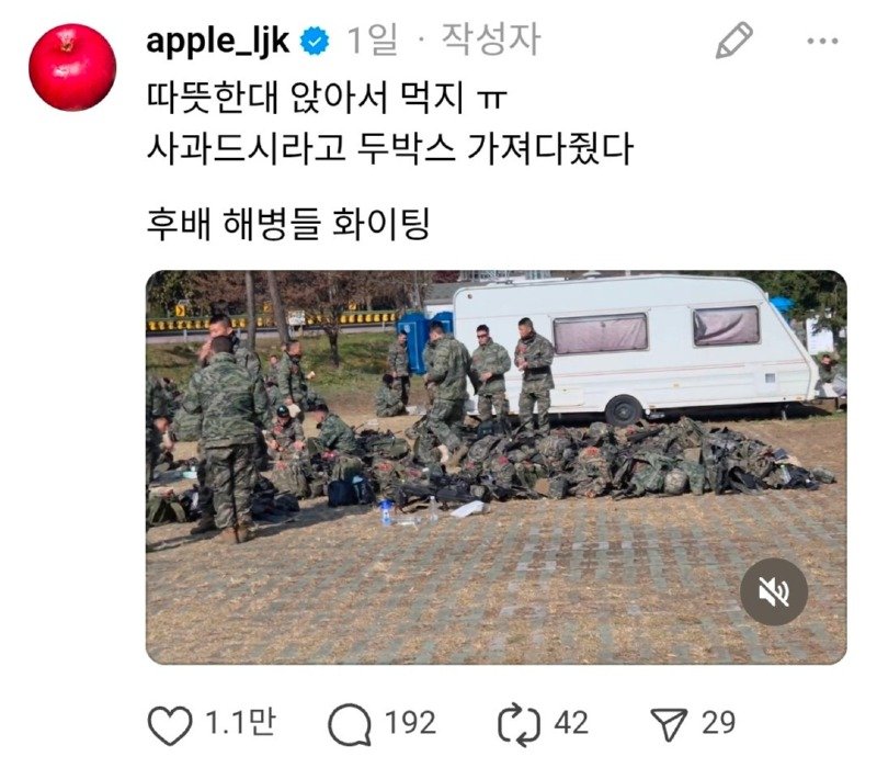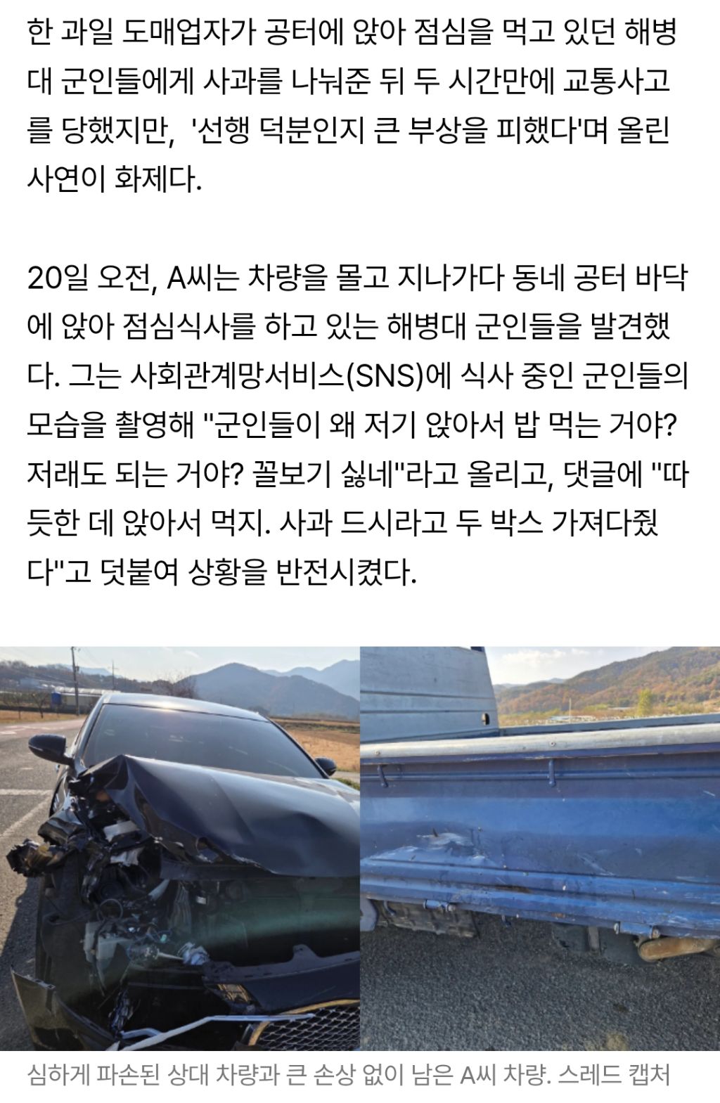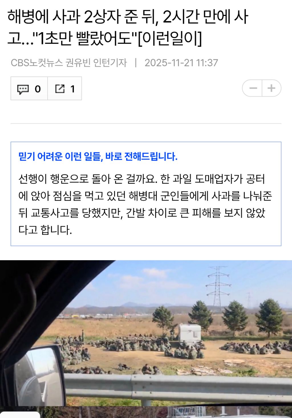[기사]군인들 꼴 보기 싫게 왜 저기서 밥을 먹는거야? 작성자러바오|작성시간25.11.24|조회수9,014 목록 댓글 1 글자크기 작게가 글자크기 크게가 https://www.nocutnews.co.kr/news/6432069해병에 사과 2상자 준 뒤, 2시간 만에 사고…"1초만 빨랐어도"[이런일이]한 과일 도매업자가 공터에 앉아 점심을 먹고 있던 해병대 군인들에게 사과를 나눠준 뒤 두 시간만에 교통사고를 당했지만, '선행 덕분인지 큰 부상을 피했다'며 올린 사연이 화제다. 20일 오전, www.nocutnews.co.kr 다음검색 현재 게시글 추가 기능 열기 북마크 공유하기 신고 센터로 신고 댓글 댓글 1 댓글쓰기 답글쓰기 댓글 리스트 작성자우정잉5 | 작성시간 25.11.24 ㄷㄷㄷ 댓글 전체보기