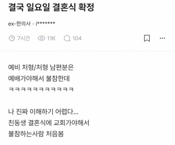 근데 결혼식을 하루종일 하는게 아니니 결혼식을 못간다는건 자기 고집임.