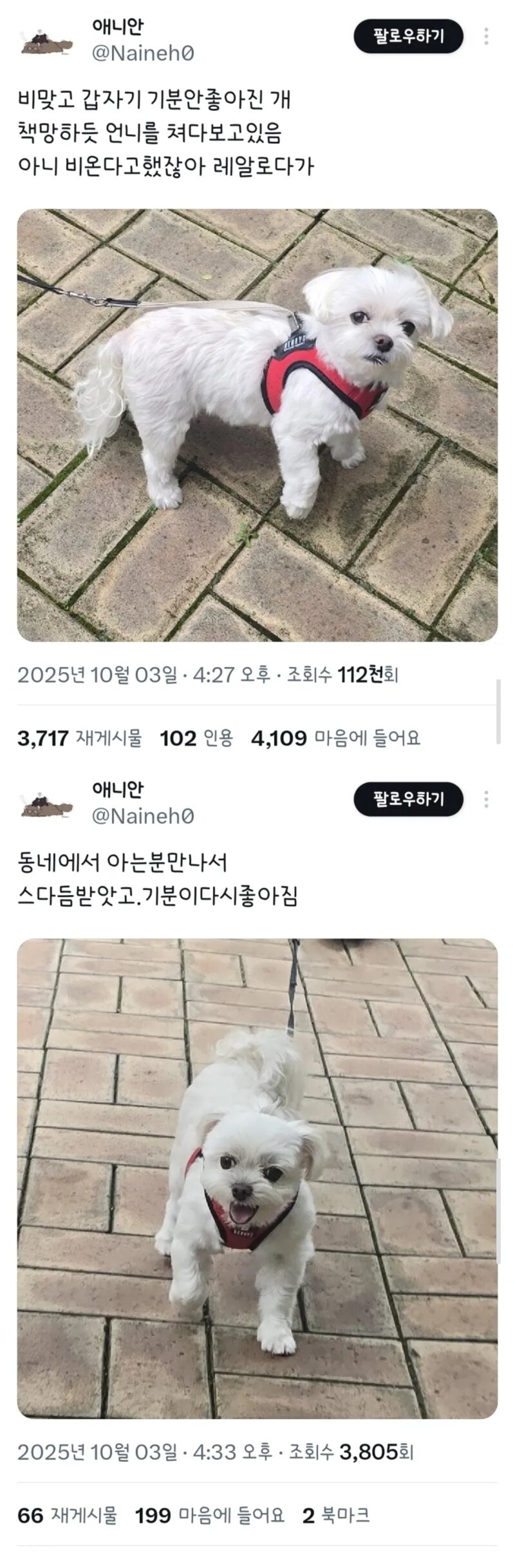 [동물]비 맞고 갑자기 기분 안 좋아진 개. 책망하듯 언니를 쳐다보고 있음. 작성자러바오|작성시간25.11.24|조회수8,885 목록 댓글 3 글자크기 작게가 글자크기 크게가 다음검색 현재 게시글 추가 기능 열기 북마크 공유하기 신고 센터로 신고 댓글 댓글 3 댓글쓰기 답글쓰기 댓글 리스트 작성자즐거운세상 | 작성시간 25.11.24 귀여워 ㅠㅠㅠㅠㅠ 작성자뽀무빵삑 | 작성시간 25.11.24 ㅋㅋㅋㅋㅋㅋㅋㅋ 작성자프랭크 램파드 | 작성시간 25.11.24 ㄱㅇㅇ 댓글 전체보기