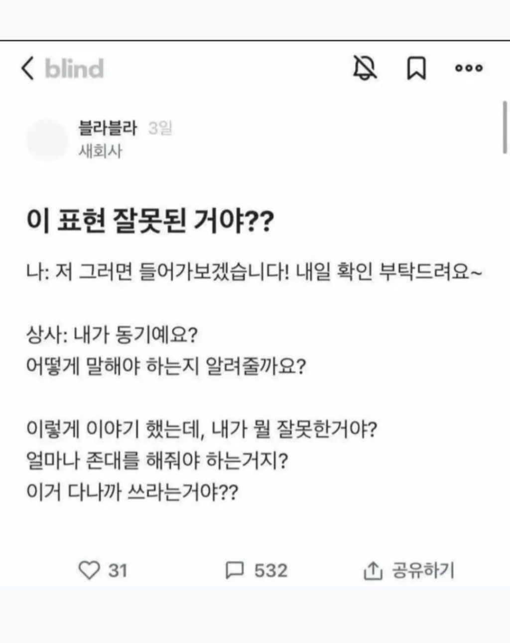 [기타]표현이 잘못된 건지 물어보는 블라인.jpg 작성자강동구주민 3|작성시간25.11.25|조회수10,462 목록 댓글 4 글자크기 작게가 글자크기 크게가 다음검색 현재 게시글 추가 기능 열기 북마크 공유하기 신고 센터로 신고 댓글 댓글 4 댓글쓰기 답글쓰기 댓글 리스트 작성자KLOPP | 작성시간 25.11.25 ㅋㅋㅋㅋㅋㅋ별 지럴이네 작성자김 연아 | 작성시간 25.11.25 앞뒤 사정은 봐야겠지만 상사에게 업무지시조로 말하거나 내 스케줄에 니가 맞추라는 식으로 얘기하면 아무리 쿠션어를 사용한들 상사 입장에선 불쾌하기 그지없음ㅋㅋ 작성자까리끼께 | 작성시간 25.11.25 네 잘못된거 맞습니다. 작성자이라또 | 작성시간 25.11.25 저걸 존대의 문제라고 생각하니 해결이 안되는 것.... 댓글 전체보기