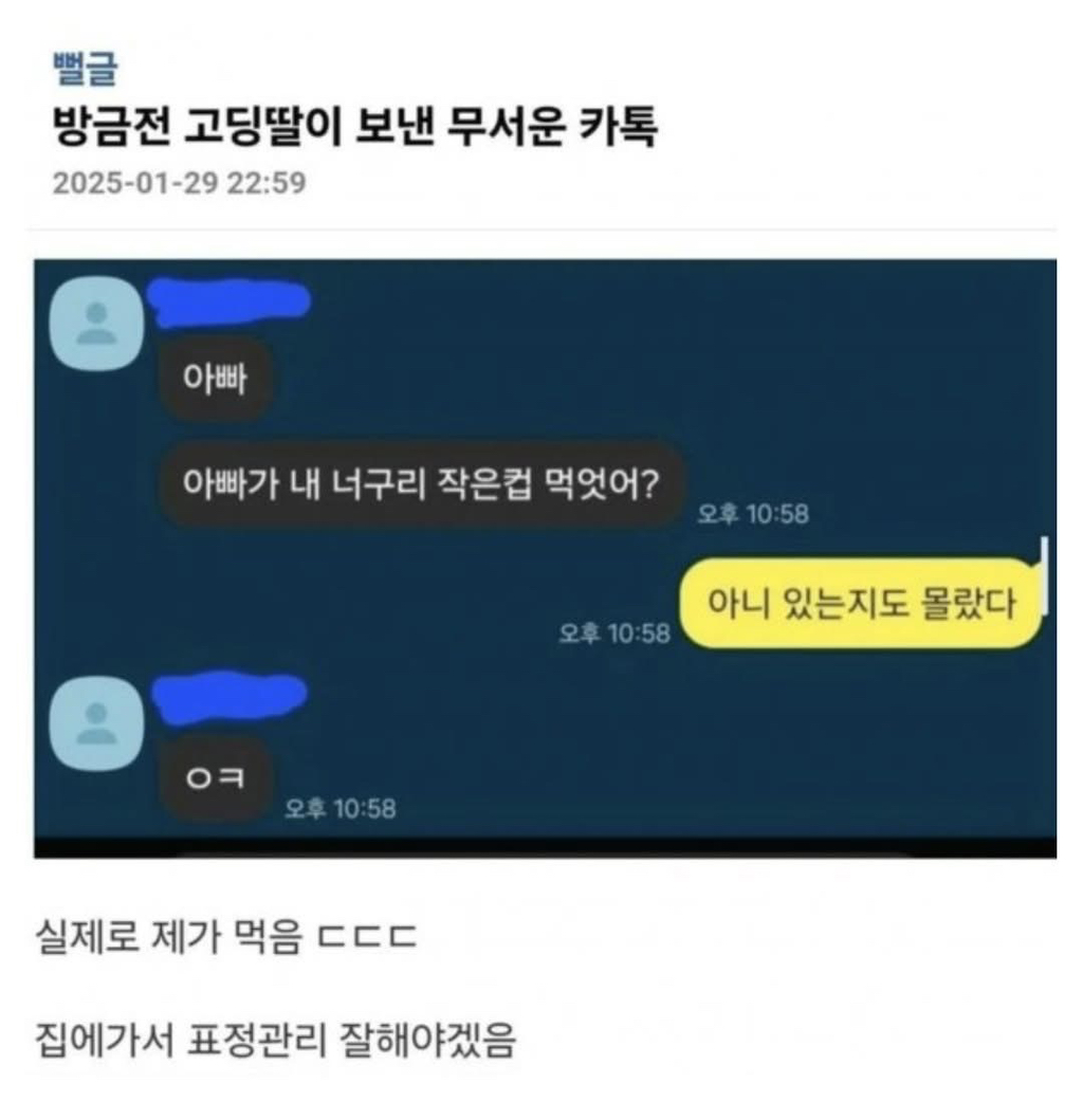 고딩딸이 보낸 무서운 카톡 작성자가을날3|작성시간25.11.26|조회수27,649 목록 댓글 7 글자크기 작게가 글자크기 크게가 다음검색 현재 게시글 추가 기능 열기 북마크 공유하기 신고 센터로 신고 댓글 댓글 7 댓글쓰기 답글쓰기 댓글 리스트 작성자셉셉이 | 작성시간 25.11.26 싸늘하다 작성자Jesse Lingard | 작성시간 25.11.26 가면서 좀 사가면 되지ㅋㅋ 작성자플레이오프 | 작성시간 25.11.26 와.. 작성자개소리하는 놈한테 개짖는 멍멍이 | 작성시간 25.11.26 퇴근하면서 컵라면이랑 컵케이크 사들고가야 기분 풀릴듯 작성자커버낫 | 작성시간 25.11.26 솔직히 말해야지 댓글 전체보기