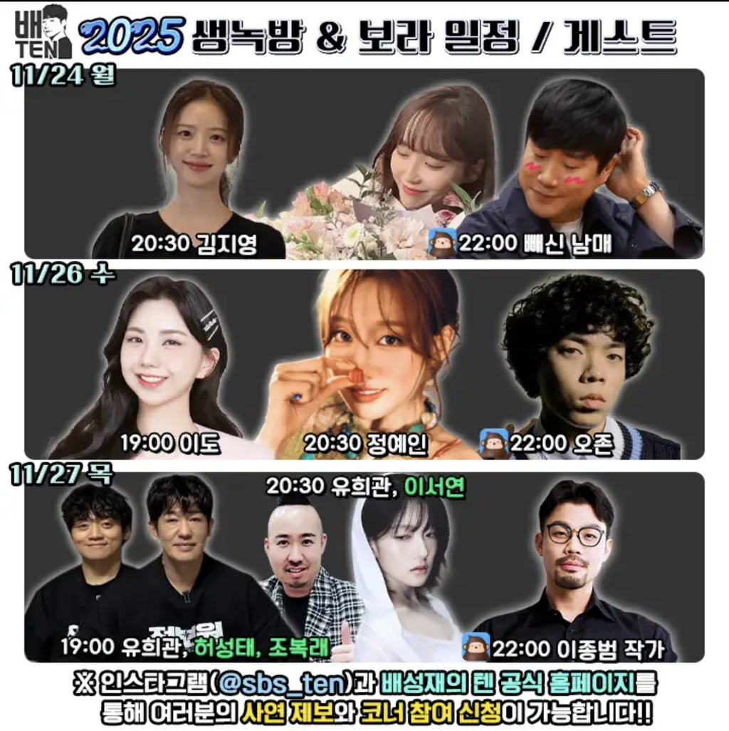 배성재의 텐, 다음주 게스트 작성자인천서포터즈|작성시간25.11.26|조회수3,322 목록 댓글 4 글자크기 작게가 글자크기 크게가 다음검색 현재 게시글 추가 기능 열기 북마크 공유하기 신고 센터로 신고 댓글 댓글 4 댓글쓰기 답글쓰기 댓글 리스트 작성자Mateja Kezman | 작성시간 25.11.26 이도도 나오는구나 작성자Michael essien | 작성시간 25.11.26 이번주네요 작성자Lovelyz 류수정 | 작성시간 25.11.26 이번주 이미 나미춘 나와서 난 괜찮아 한 곡 뽑고 갔습니다 ㅋㅋㅋㅋ 작성자주바페 | 작성시간 25.11.26 나미춘 블랙박스한테 져서 추가 출연권 날아갔음ㅋㅋ 댓글 전체보기