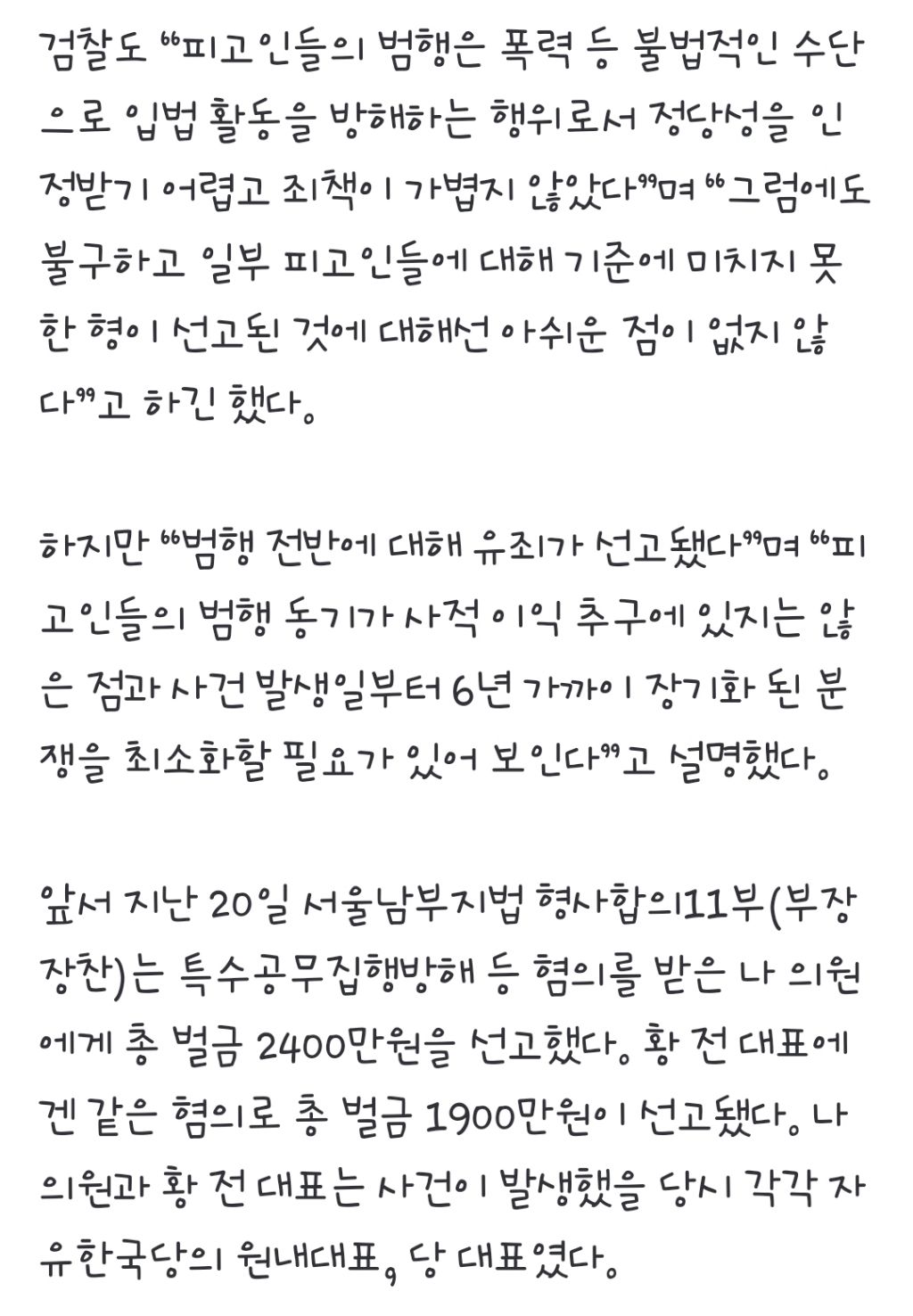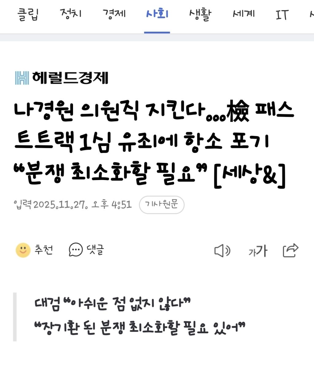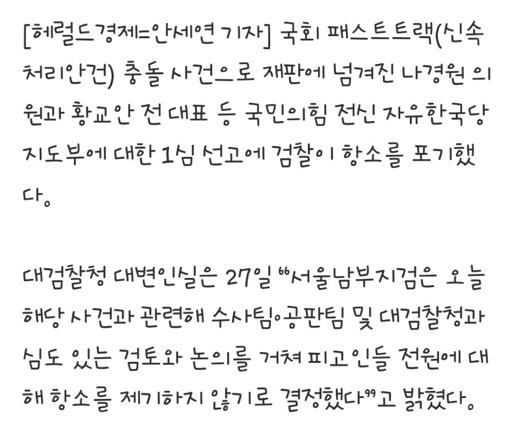 [기사]나경원 의원직 지킨다…檢 패스트트랙 1심 유죄에 항소 포기 “분쟁 최소화할 필요” 작성자1억개의별|작성시간25.11.27|조회수2,183 목록 댓글 48 글자크기 작게가 글자크기 크게가 https://n.news.naver.com/article/016/0002564136?sid=102나경원 의원직 지킨다…檢 패스트트랙 1심 유죄에 항소 포기 “분쟁 최소화할 필요” [세상&]대검 “아쉬운 점 없지 않다” “장기환 된 분쟁 최소화할 필요 있어” 나경원 국민의힘 의원이 지난 20일 서울 양천구 서울남부지방법원에서 열린 ‘국회 패스트트랙 충돌’ 1심 선고 공판을 n.news.naver.com 다음검색 현재 게시글 추가 기능 열기 북마크 공유하기 신고 센터로 신고 댓글 댓글 48 댓글쓰기 답글쓰기 댓글 리스트 작성자김민주 | 작성시간 25.11.27 ㅋㅋ 작성자ppoo | 작성시간 25.11.27 진짜 투명하네 작성자가소스 | 작성시간 25.11.27 욕 나온다 진짜 작성자I.B.I LUV | 작성시간 25.11.27 항소포기 야....... 제발 빨리 해체 좀 해줘 자꾸 저러잖아 작성자이게뭔일이람 | 작성시간 25.11.28 댓글 전체보기